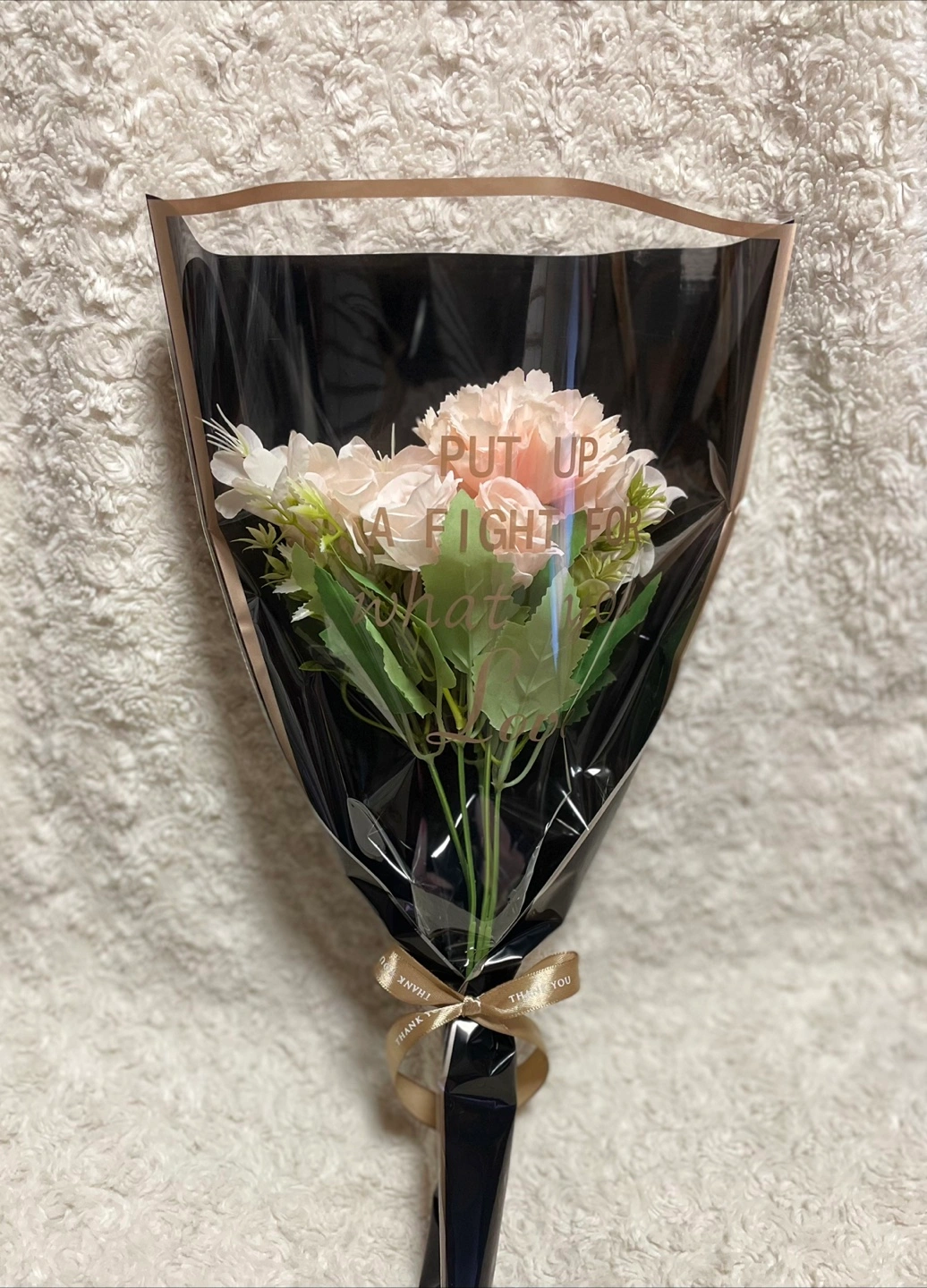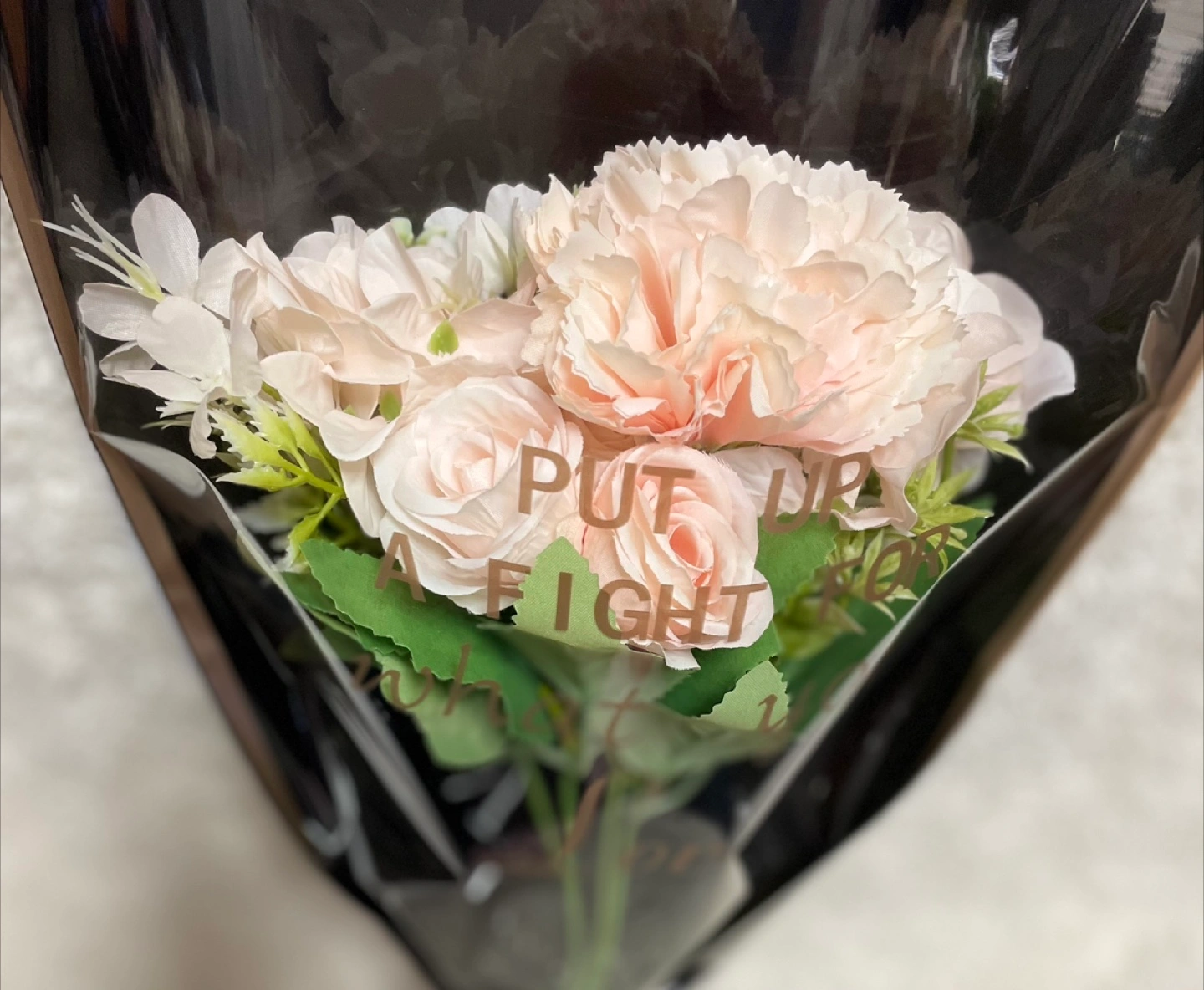 あたたかさピンクのカーネーションと白い花のアレンジメント、メッセージ付きのスタイリッシュな花束です。 - 花束のデザイン: ピンクのカーネーションと白い花のアレンジメント - 包装: 黒い透明フィルムで包装されている - メッセージ: 「PUT UP A FIGHT」と印刷されたデザイン - リボン: ベージュのリボン付き -長さ:30cm #母の日 #プレゼント ご覧いただきありがとうございます。