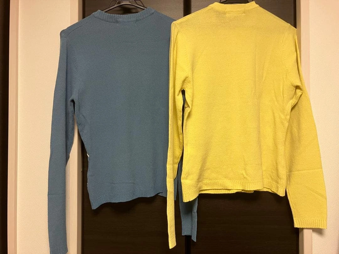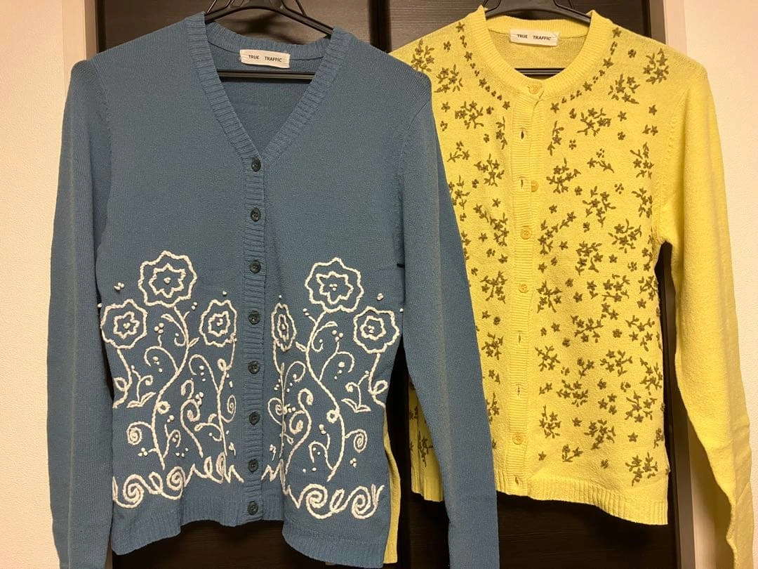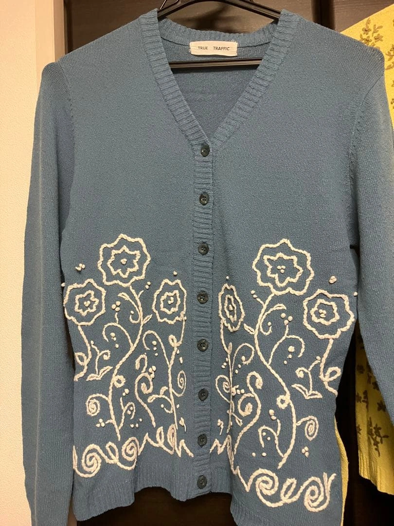 花柄刺繍デザインの長袖カーディガン2点セットです。 着心地の良いストレッチ素材。 - 色: イエロー (丸首) - 色: ブルー (Vネック) - デザイン: 花柄刺繍 - スタイル: カーディガン サイズM 身幅42cm 着丈55cm 2〜3回着用しました。 ご希望の方はお気軽にご連絡ください。