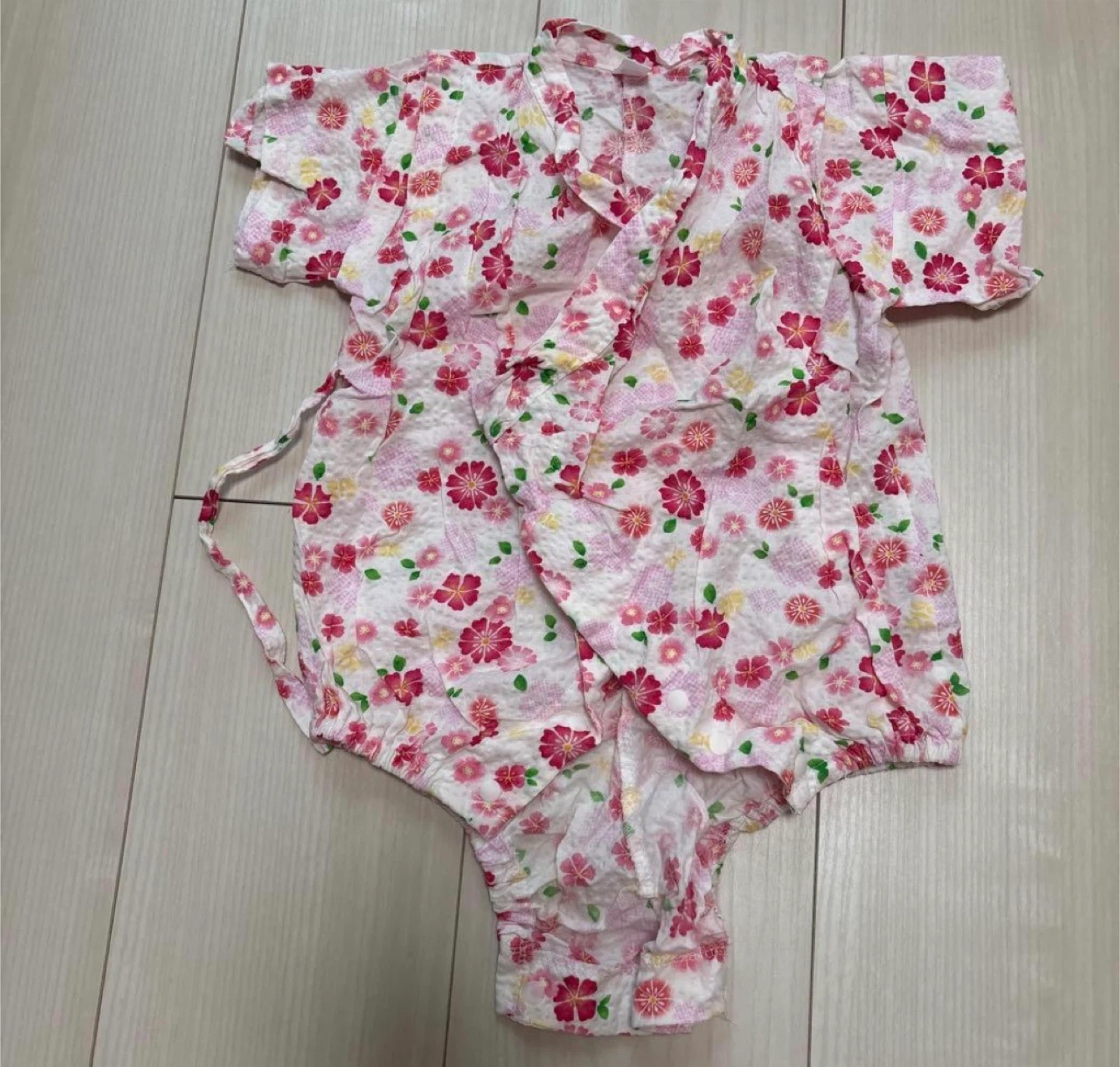 あたたかさ花柄のベビー用ロンパース浴衣です。 コットン100%です。 ・サイズ:70 ・色:ピンク、白 ・花柄デザイン ・使用感少なめ 中古品であることをご了承ください。