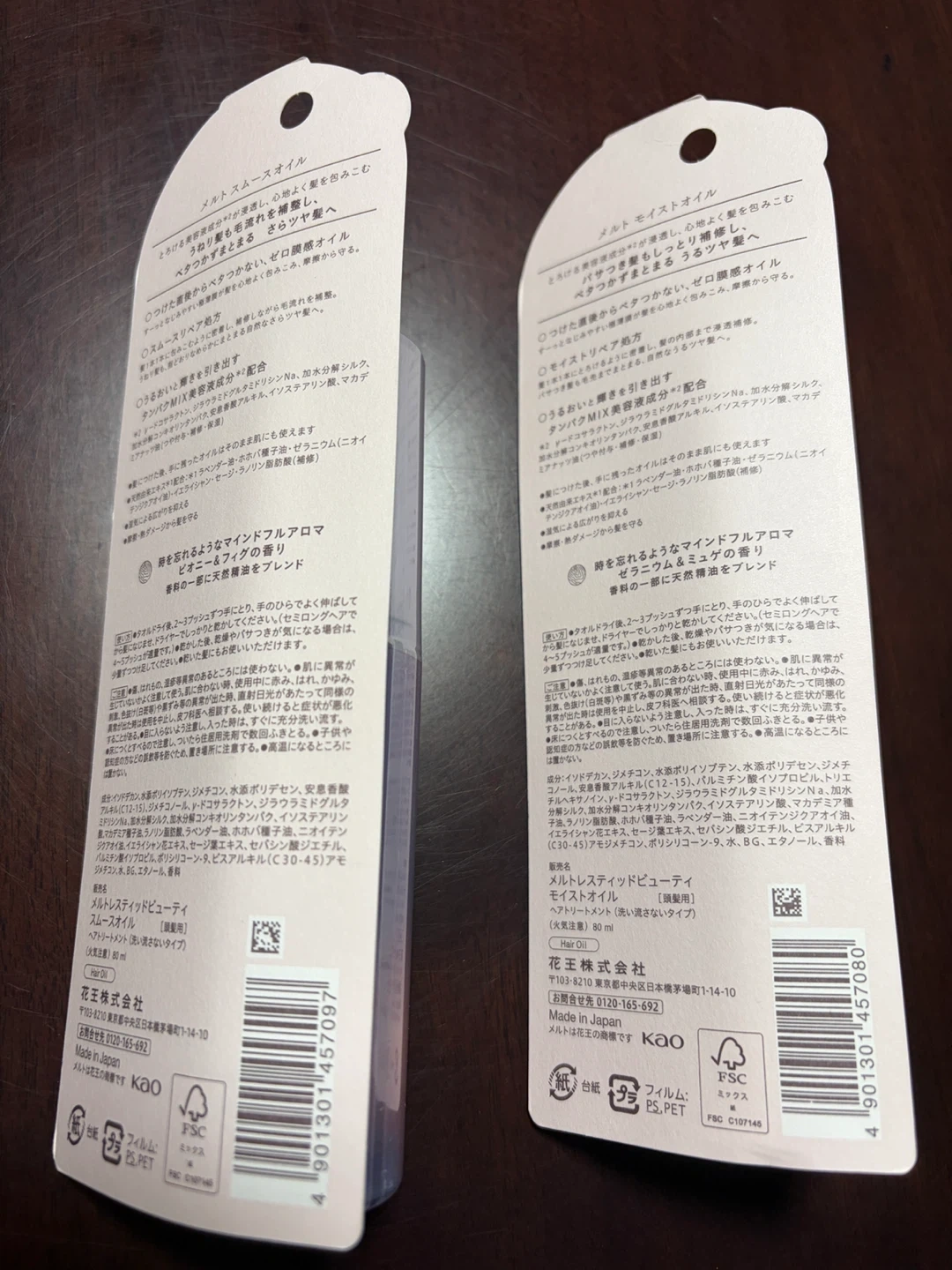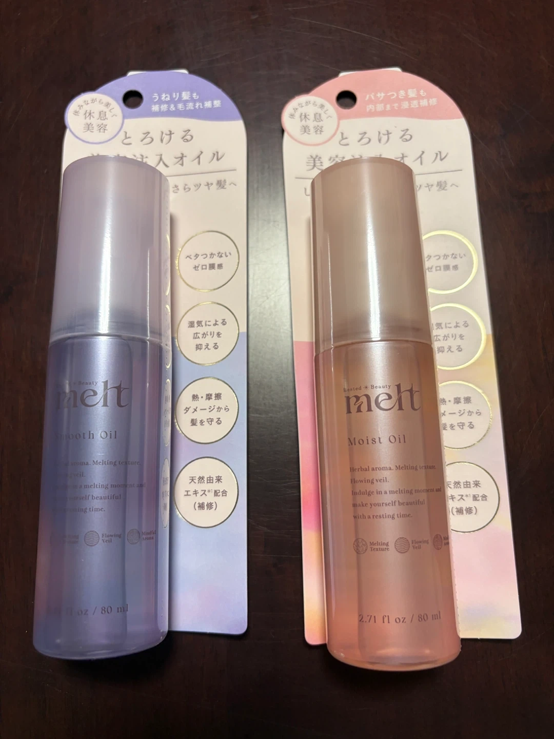 新品・未開封/花王 melt(メルト)美容液ヘアオイル 2種セット とろけるように髪になじむ、話題の「メルト 美容液ヘアオイル」2本セットです。 どちらも 未開封・新品 です。 スムースオイル(Smooth Oil) うねり髪・広がりが気になる方におすすめ。 べたつかず、サラッと軽やかにまとまるタイプ。 熱・摩擦ダメージから髪を守り、ツヤのある仕上がりへ。 やさしいウィンドフルアロマの香り。 定価:税込1,540円 モイストオイル(Moist Oil) パサつき・乾燥が気になる髪におすすめ。 しっとりまとまる、うるおい重視タイプ。 乾燥・湿気による広がりを抑え、毛先までまとまる髪に。 同じくウィンドフルアロマの香り。 定価:税込1,540円 ⸻ 内容量:各80ml 状態:新品・未開封 定価合計:3,080円(税込)