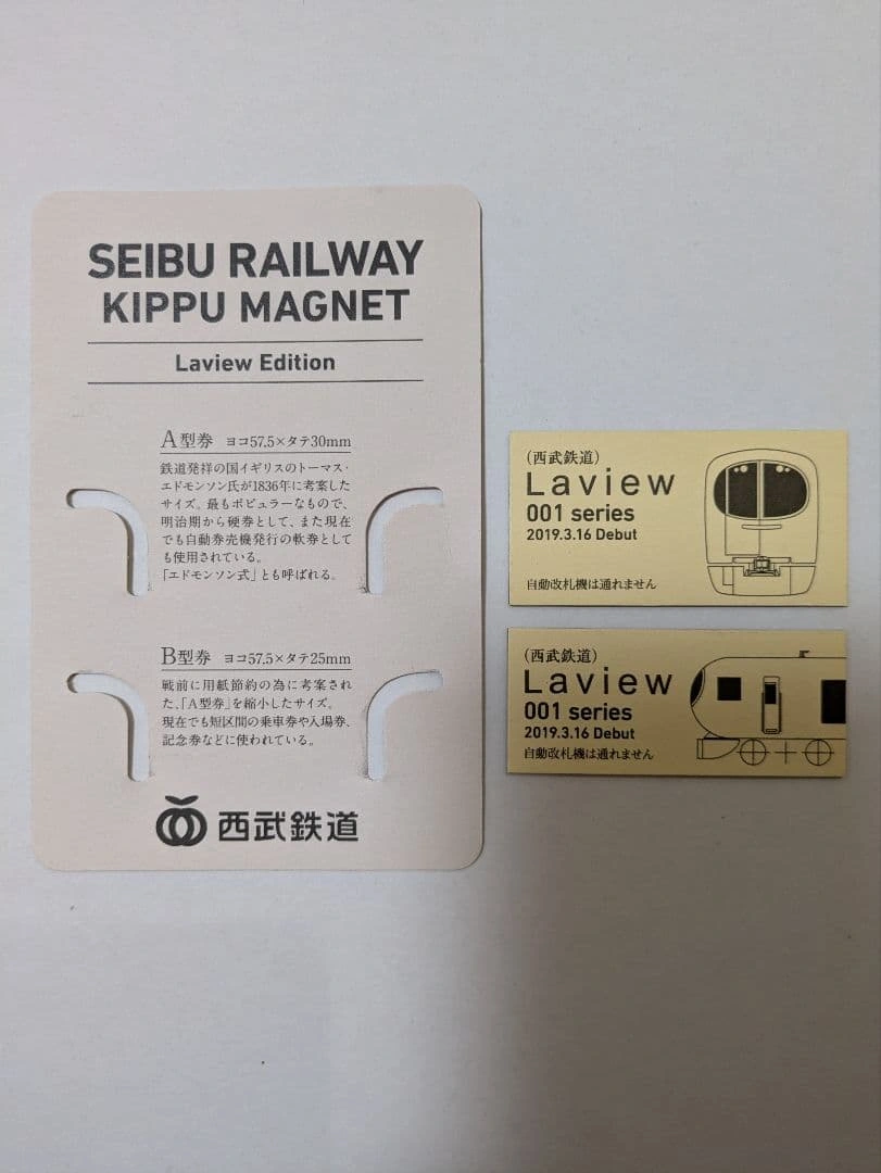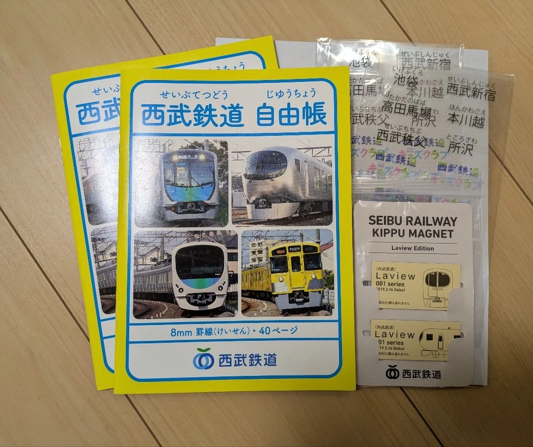 西武鉄道のグッズです。 ・8mm罫線 40ページ 鉄道自由帳2冊 ・シール2枚 ・ラビュー 切符マグネット ラビューのマグネットのみ開封済みです。 ご覧いただきありがとうございます。