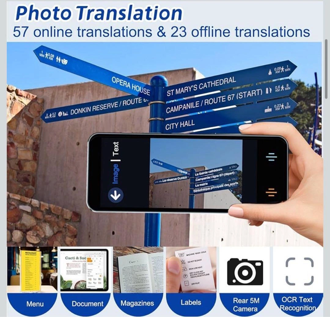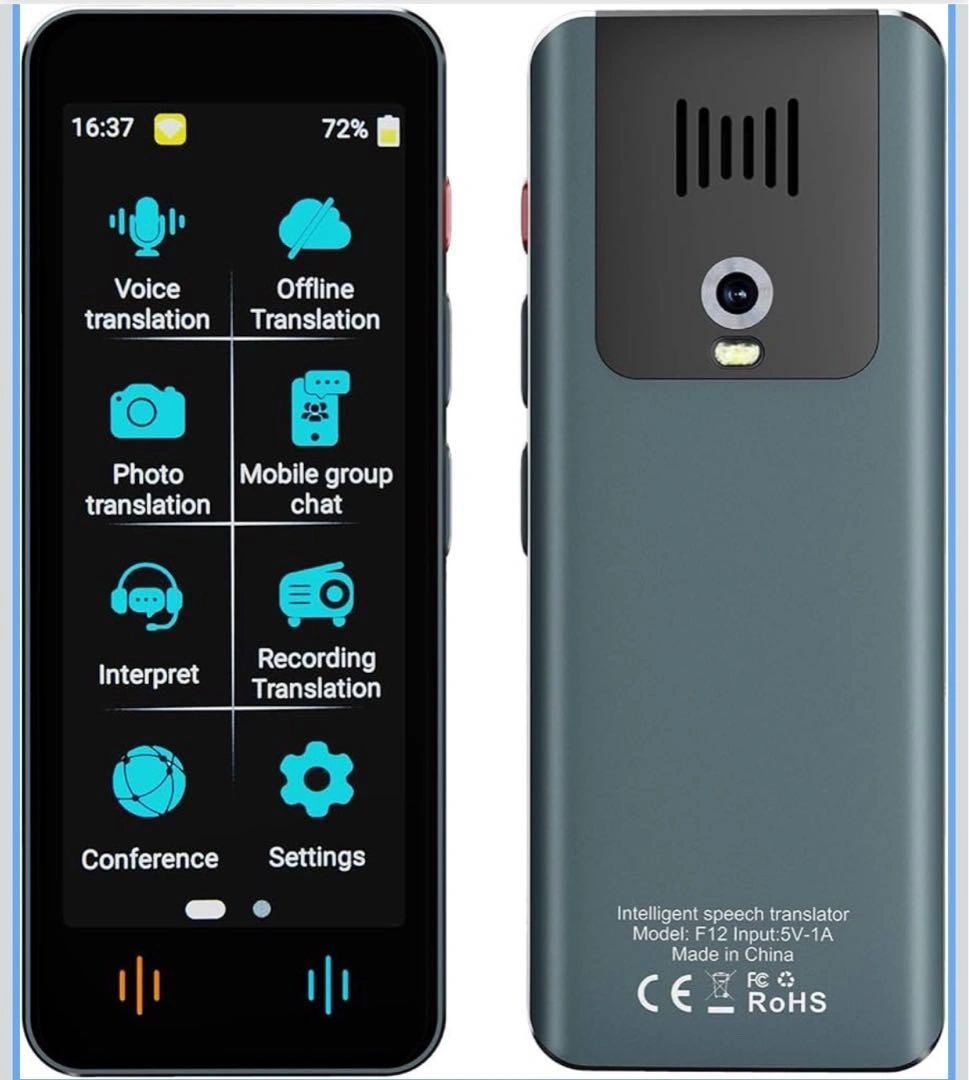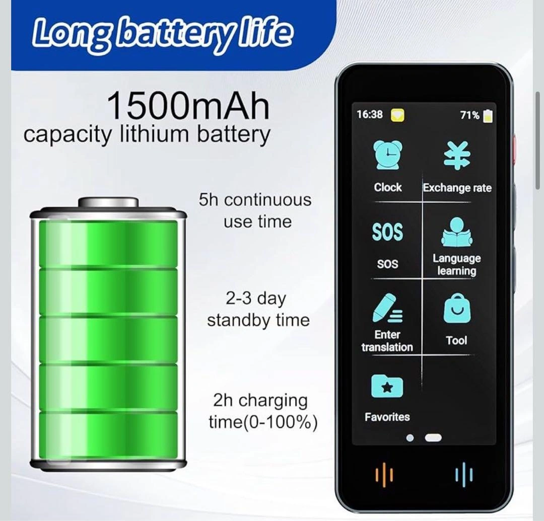 ご覧頂きありがとうございます。 142言語に対応した言語翻訳デバイスです。最大98%の精度でリアルタイム双方向音声翻訳をサポートします。 オフライン翻訳機能:18種類の常用言語に対応(スペイン語、フランス語、イタリア語、ポルトガル語、オランダ語、英語、ドイツ語、中国語、日本語、韓国語、ロシア語、タイ語、インドネシア語、ヒンディー語)。Wi-Fi接続なしで使用可能。 画像翻訳:500万画素のカメラ搭載。57言語のオンライン写真翻訳と23言語のオフライン写真翻訳をサポート。 バッテリー:1500 mAh。4-5時間連続稼動可能。TYPE-C充電。 4インチHD IPSタッチスクリーン搭載。インターフェイスはシンプルで直感的です。 ご不明点はお気軽にお問い合わせください。
