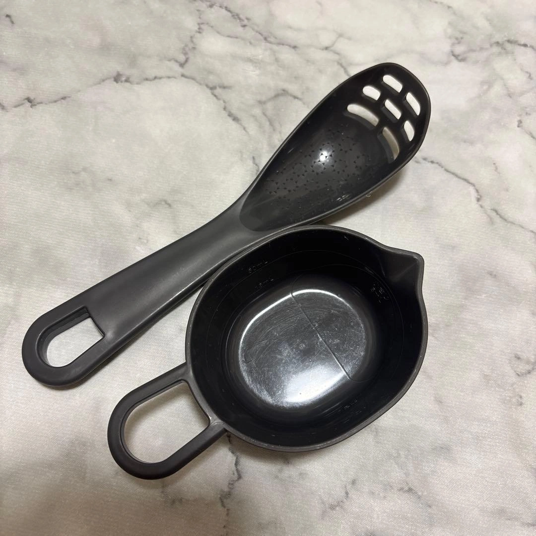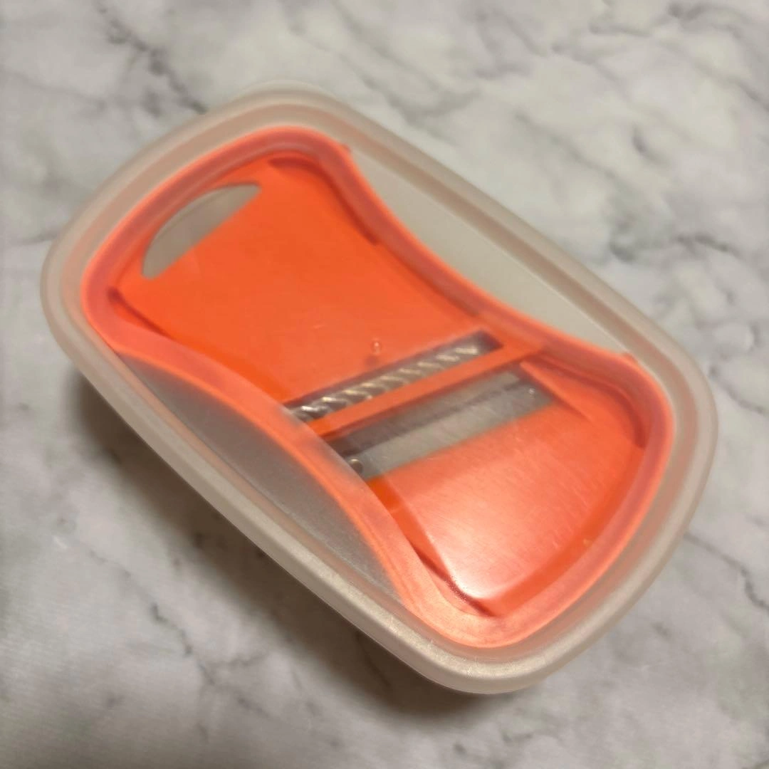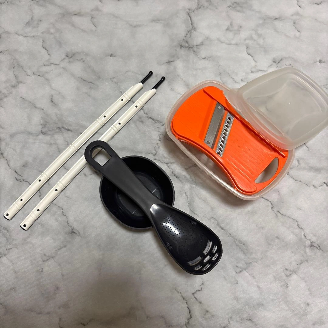 タッパー付き千切りスライサー、計量カップ&万能スプーンセット、フードクリップのセットです。 ・千切りスライサー スライサーがタッパーにセットできるようになっています。スライサーを裏返してセットすると、そのまま蓋を閉めて収納できます。 ・計量カップ&万能スプーンセット 持ち手を重ねることで、2つをくっつけた状態で収納できます。 計量カップは小さじ(5ml)、大さじ(15ml)、1/4カップ(50ml)が計量できます。 万能スプーンは、スプーンとして使用するほか、マッシャー・すりおろし器として使用できます。 ・フードクリップ 袋を折りたたみ、挟むようにスライドさせることで袋の口を閉じることができます。 横幅22cmです。 ◆状態 数回使用しておりますが、汚れや傷はありません。 ◆梱包 水濡れ防止のビニールに入れ、緩衝材(プチプチ)にて梱包いたします。 その他ご要望がある方はお気軽にお申し付けくださいませ。 ご希望の方はお気軽にご連絡ください。