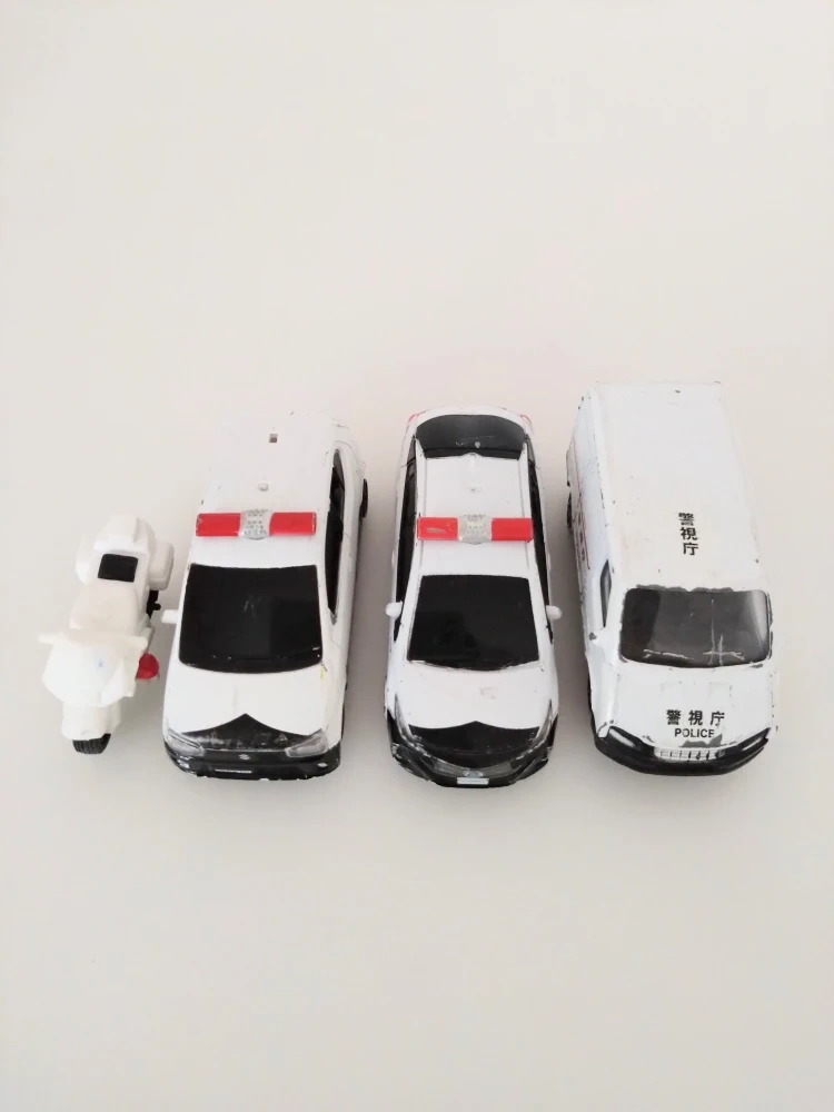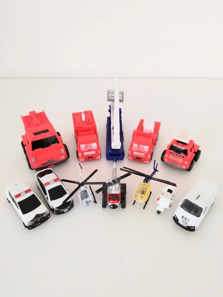 警察車両は汚れあります。 赤色灯が完全に固定されておらずグルグル回ってしまいます。 白バイはタイヤまで全てゴム製の為走行させる事は出来ません。 白のヘリコプターは脚が破損しております。 写真参照下さい。 消防車の中央2台は荷台にはしごがあったのですが紛失の為写真の状態でのお渡しになります。 ブルーのクレーン車はクレーンの折り返し部分が弱くなっております。 上に伸ばしても下にすぐ畳まれてしまいます。 中古品である事ご理解頂ける方のみ宜しくお願い致します。
