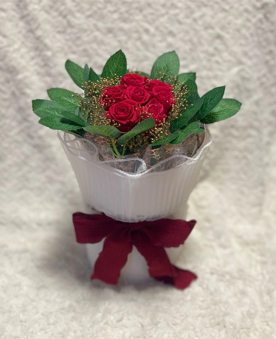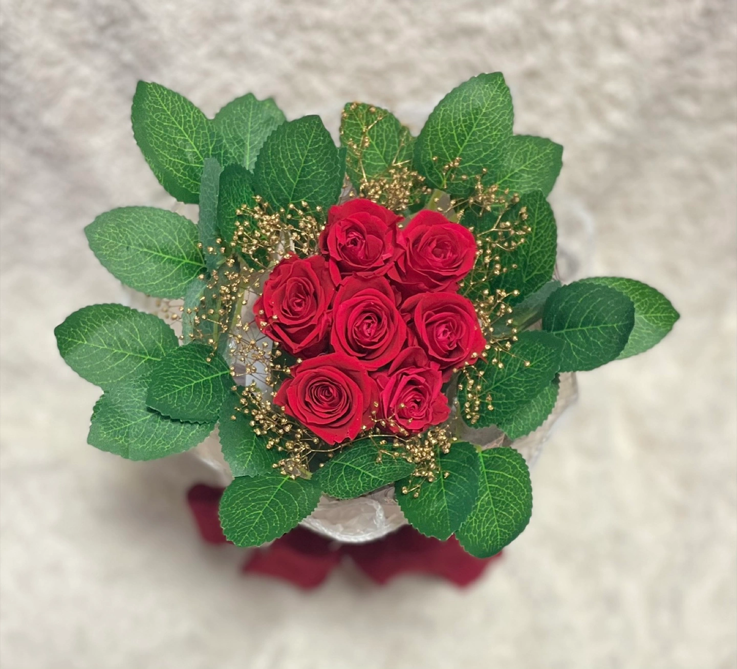 あたたかさ真っ赤なバラの花束です。 ゴールドのカスミソウが散りばめられており、華やかさを演出しています。 特別な日のお祝いやプレゼントにいかがでしょうか。 【サイズ】直径約20cm 高さ30cm 【素材】プリザーブドフラワー 未使用品ですが、自宅保管のため、神経質な方はご遠慮ください。 よろしくお願いいたします。 #ワンホンブーケ #母の日 #ブーケ #プレゼント