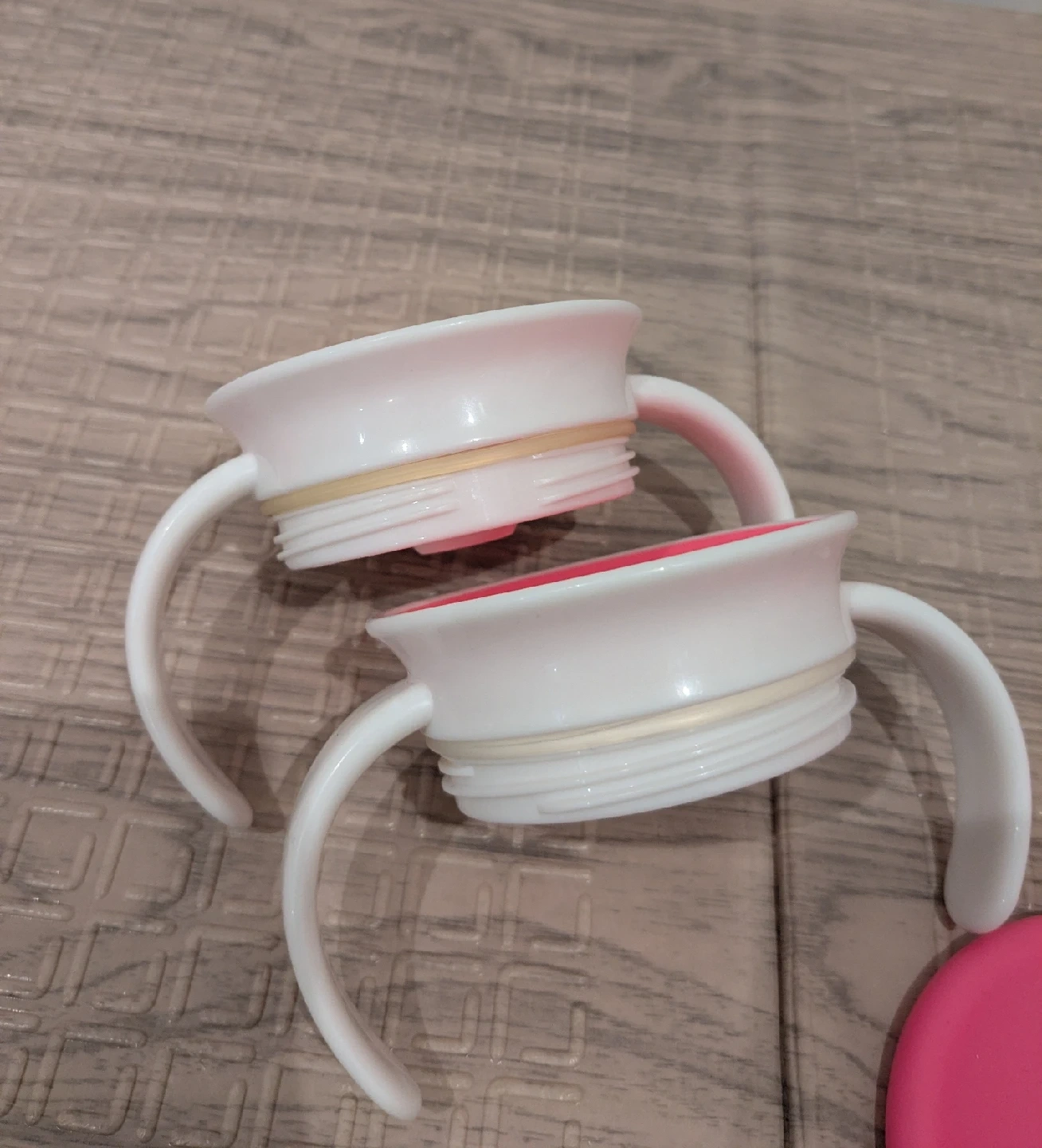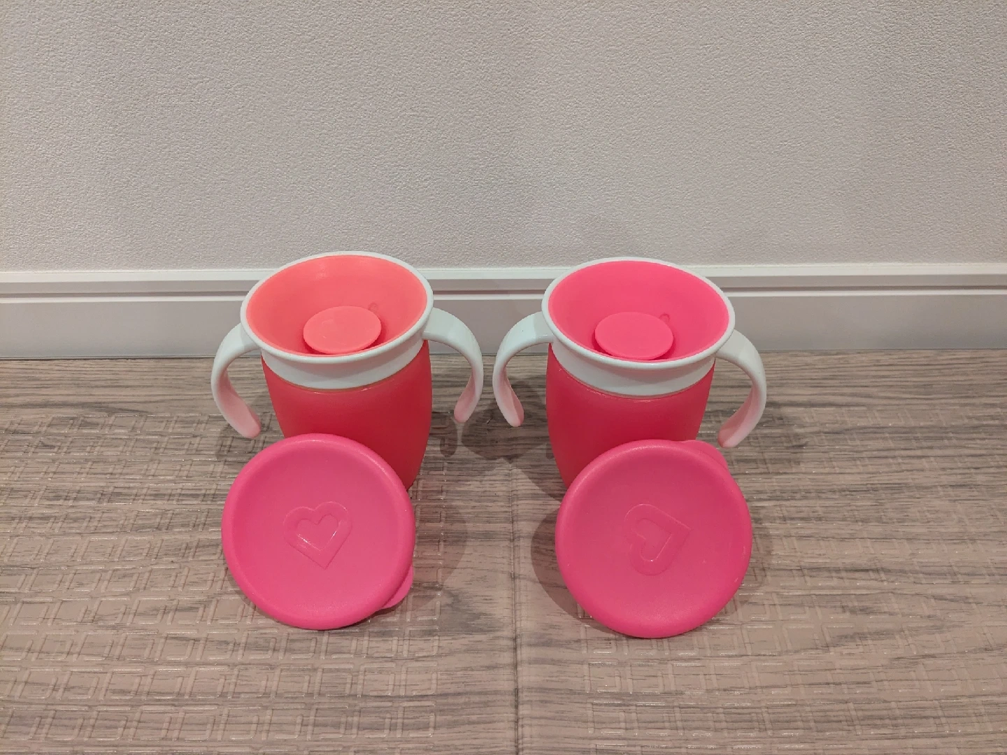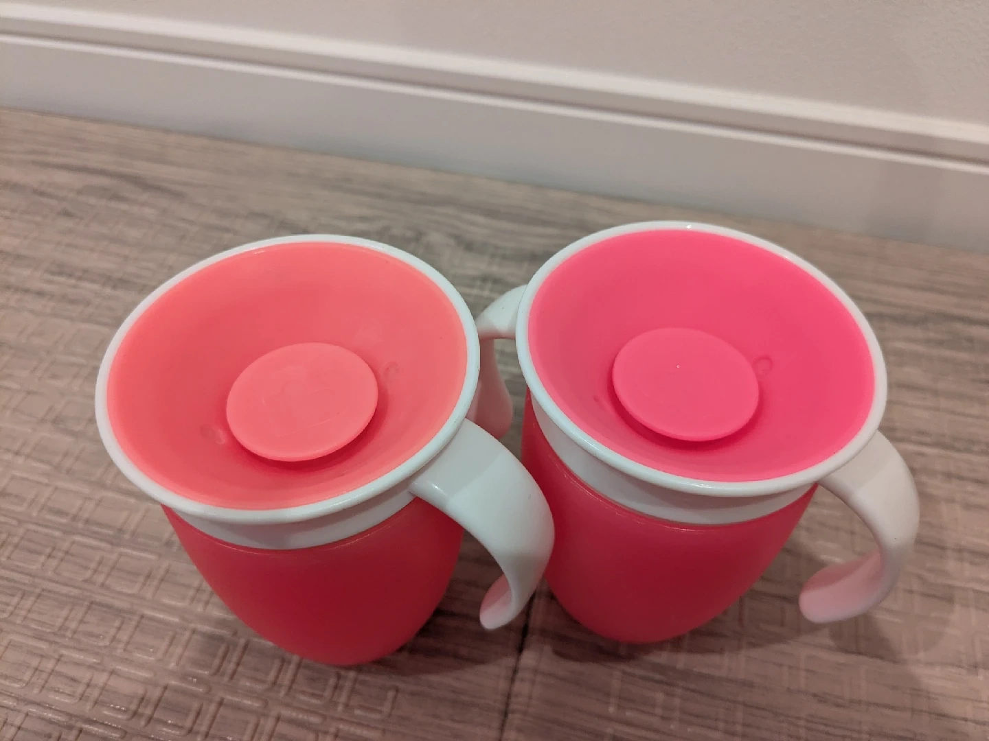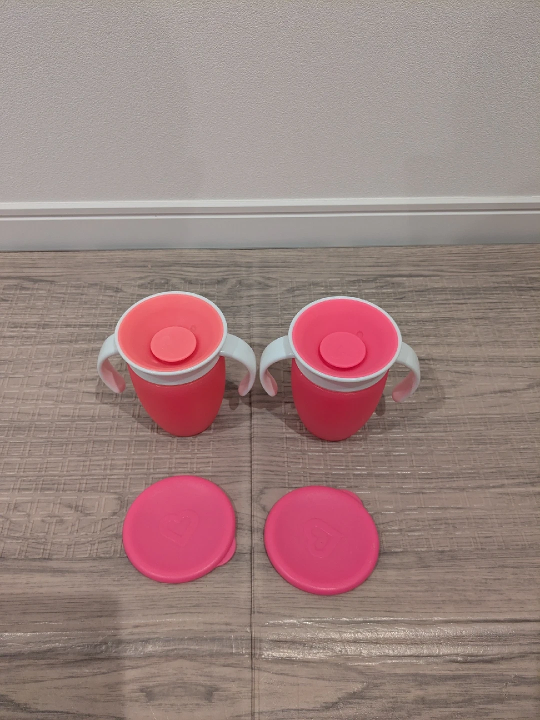 マンチキンのミラクルカップ2個セットです。倒しても中身がこぼれないので、家用とお出かけ用にも便利です。 ・色:ピンク(同じ商品ですがラバー部分の色味が少し違います。) ・使用感少なめ(全体的には綺麗ですが、片方のパッキンに変色があります。) ・付属品:フタ2個 中古品であることご了承ください ご不明点があればお気軽にご連絡ください