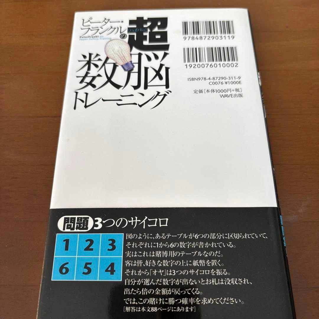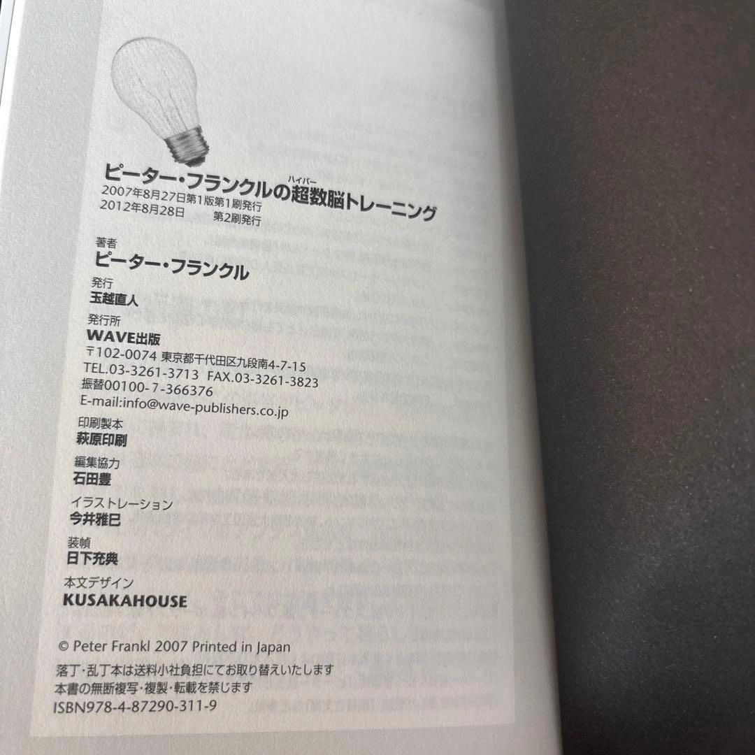 論理力を鍛えるためのトレーニング本。 - タイトル: 超数脳トレーニング - 著者: ピーター・フランクル - 出版社: WAVE出版 - 目次: 初級・中級・上級のトレーニング内容 - ISBN: 9784872903119 ご覧いただきありがとうございます。 購入後、カバー掛けて本棚にて保管していました。 折り目、汚れ、書き込みはありませんが、中古本であることをご理解願います。 ご希望の方はお気軽にご連絡ください。
