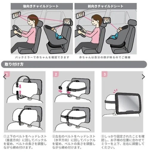 約幅29cm×高さ20cm×奥行8cm ミラーサイズ:25.5cm×15.5cm ・ミラー越しで後部座席の様子を確認できます ・ミラーはアクリル樹脂で作られているので、割れにくく、万一割れても飛び散りません ・大きなミラーで広い範囲の視界を提供することができます ・360度角度調整が可能です ・ベルトを車のヘッドレストに締め付けるだけ、バックルつきなので簡単に装着できます おもちゃをつけていたので少し傷がありますが使用には問題ないかと思います! 子供も鏡を見て笑ったりしていました! あくまでも中古品ですのでノークレームノーリターンでお願いします。 ご希望の方はお気軽にご連絡ください。