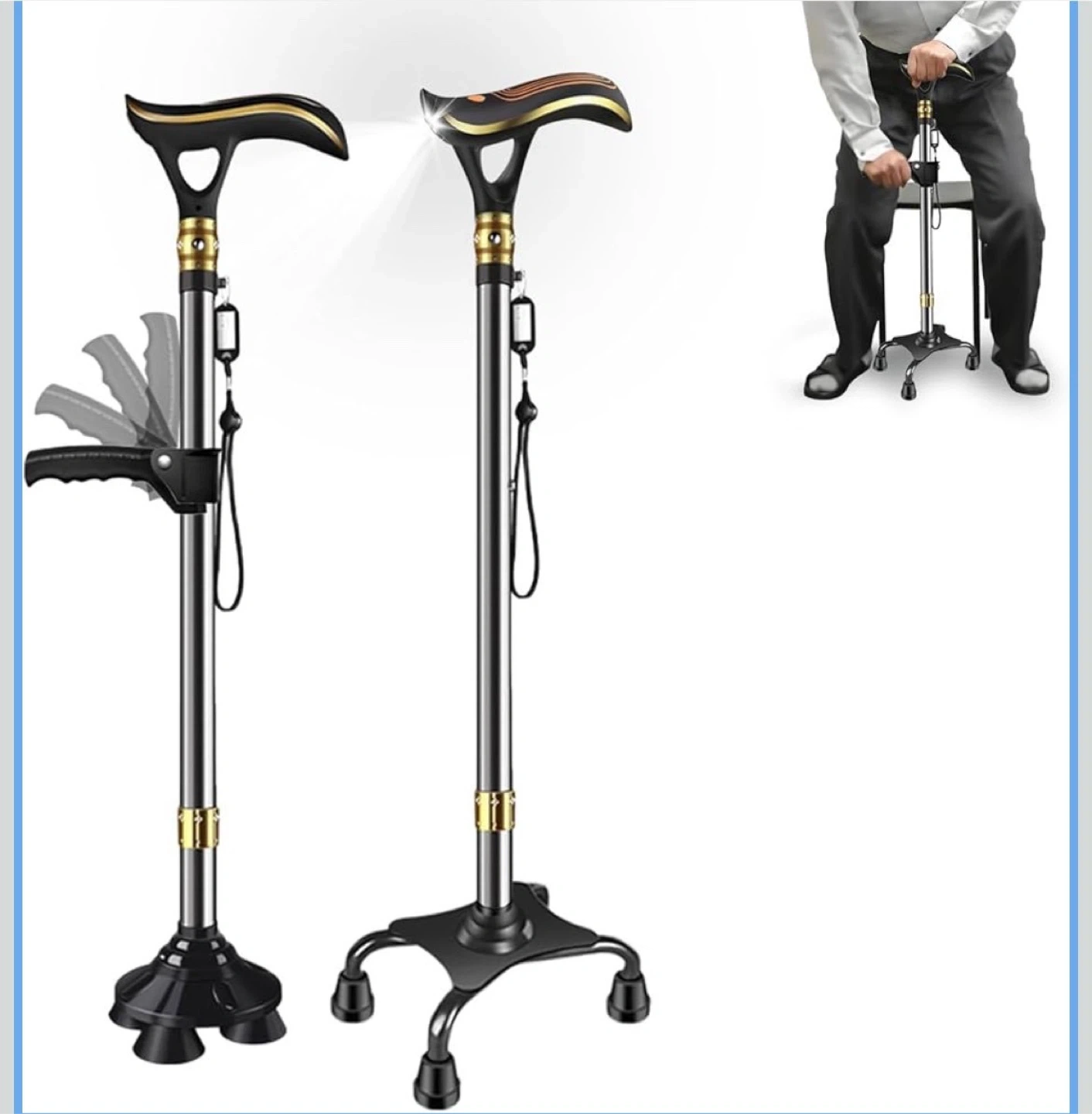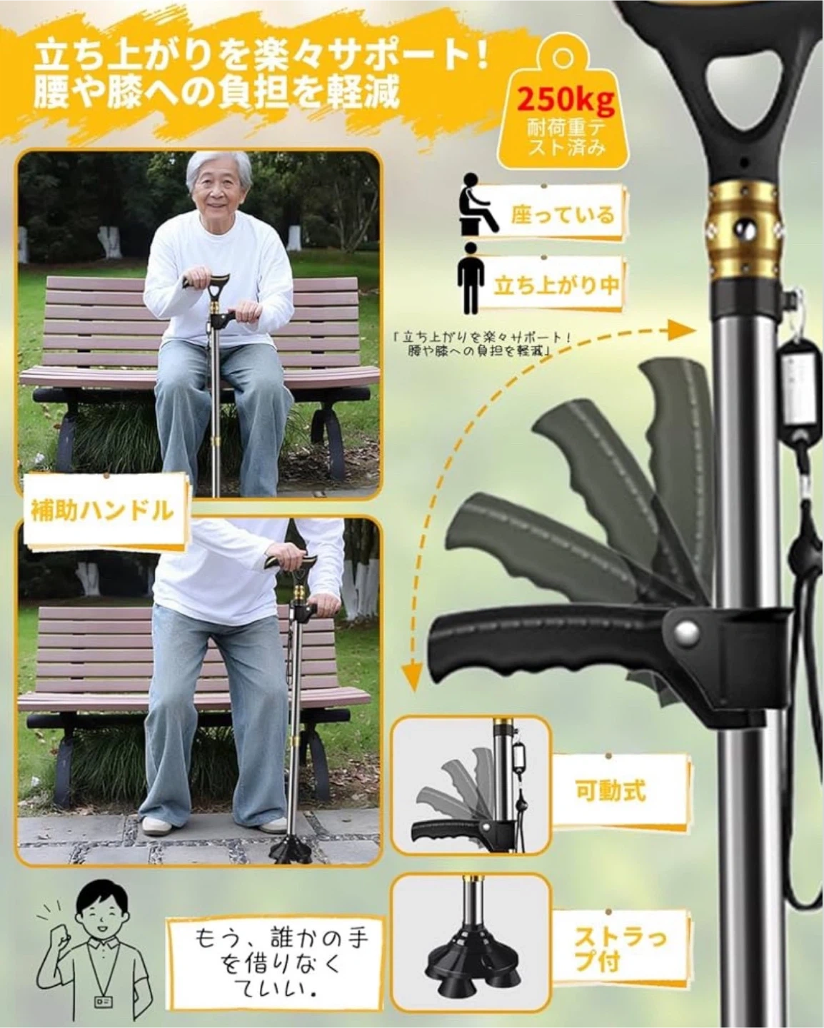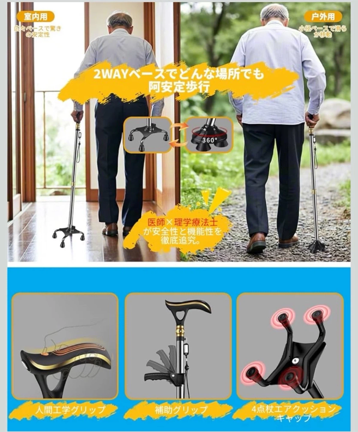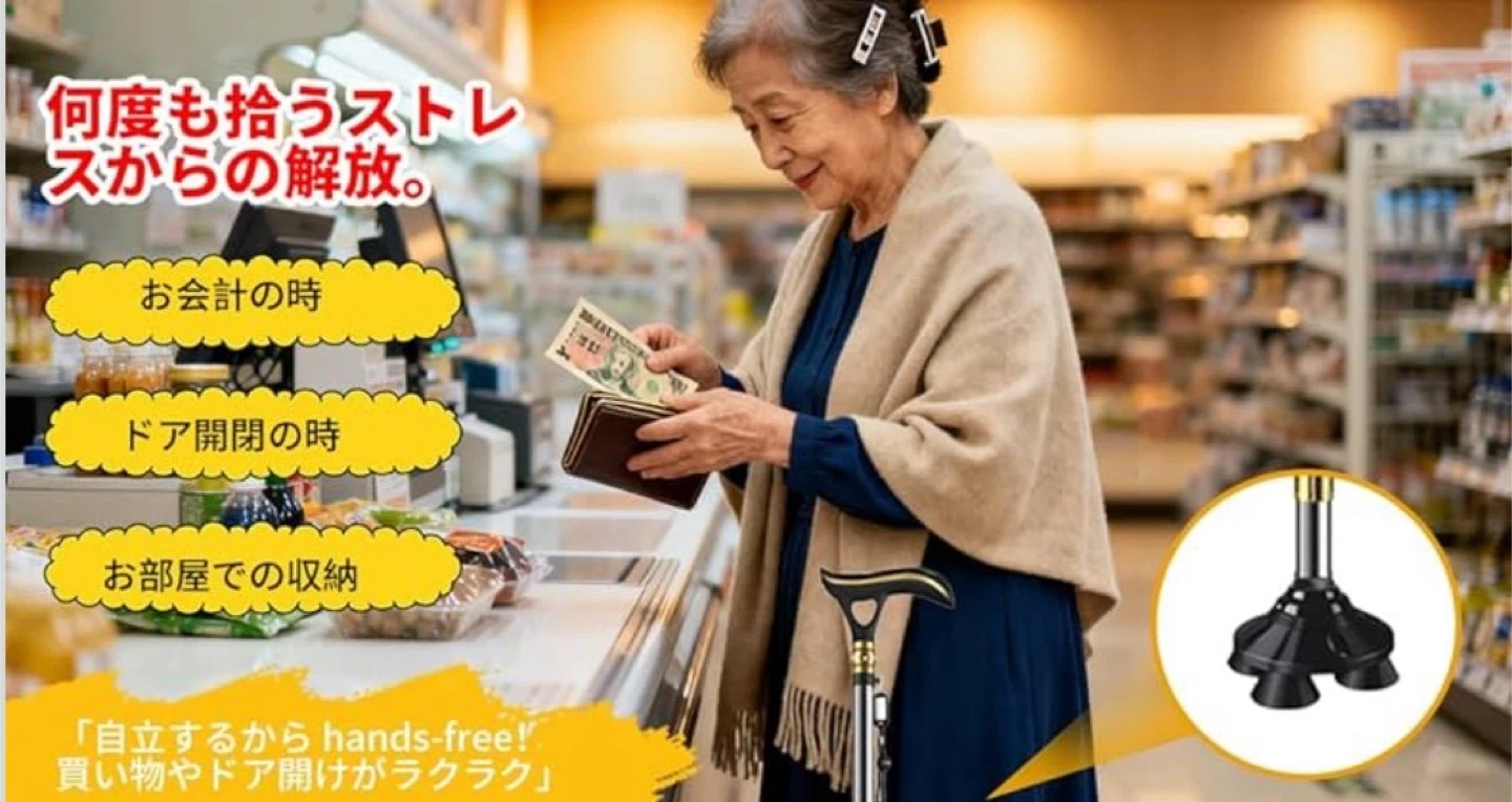 数ある中からご覧頂きありがとうございます(^○^) ◎値下げ交渉◎ ◎コメントなし、即購入大歓迎 ◎送料無料!安心の匿名配送 ★商品説明★ 【革命的な2WAYベース】 屋内户外の全地形対応 √ 連結広幅ベース(室内用)と360°回転ベース(户外用)の2WAY交換可能設計。4点支持で驚異的な安定性を実現。室内では連結広幅ベースが4点支持でがっちり支持し、自立するので荷物の多い時も安定。户外では360°回転ベースが砂利道や不整地でもスムーズな歩行を実現。タイヤ技術応用の高グリップキャップが雨の日のアスファルトや雪道でも安心。一本で屋内户外両用可能な多機能ステッキ。 【充電式LED&100dB警報】 電池交換不要の安全設計 √ 暗い夜道を明るく照らす高輝度LEDライト(角度調節可能)と100dB非常アラームを装備。USB充電式で面倒な電池交換不要、満充電で約30日間使用可能。屋内でも屋外でも、暗い場所でも明るく照らすLEDライト(角度調節可能)で段差や障害物を見落とす心配がありません。緊急時にはボタンを押すだけで約100dBの大音量アラームが鳴動し、周囲に助けを求めることができます。防水加工で悪天候にも強く、高齢者の一人暮らしにも最適。 【立ち上がり補助グリップ】 腰・膝への負担軽減 √ 椅子やベッドからの立ち上がり動作をサポートする専用補助グリップを追加。腕の力で楽に起立可能で、腰や膝への負担を大幅に軽減。リハビリ中の方や力の弱い女性にも最適で、歩行中の握り替えで疲労分散もできます。 【10段階簡単調節&快適グリップ】 身長140-190cmに完全対応 √ スプリング式ボタンで軽く押すだけの10段階高さ調節(74.5-96cm)。身長140-190cmの方にぴったりフィット。ABS素材の滑りにくい人間工学ハンドルは手の形に完璧にフィットし、圧力を分散してマメや痛みを防ぎ、長時間使用でも快適。 【軽量高耐久設計】 贈り物に最適な安心仕様 √ 高強度航空アルミニウム合金採用で軽量(約455g)かつ耐荷重250kg。板厚1.2mmの分厚いパイプで強度と耐久性が格段に向上(耐荷重250kg)。4点式の広いベースとエアサスペンション式の滑り止めキャップにより、静音性とグリップ力を両立。落下防止ストラップ&名札付き。日本語説明書+1年間保証で敬老の日のプレゼントに最適