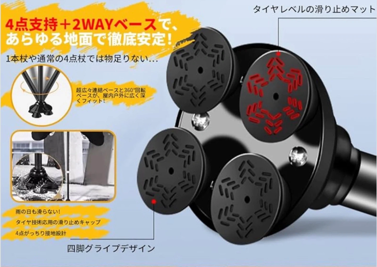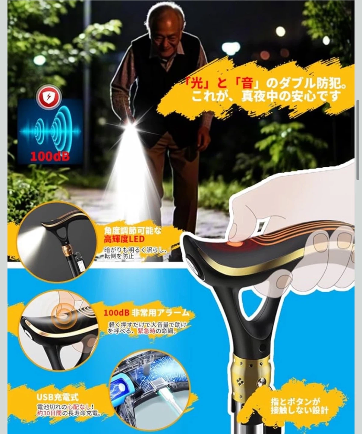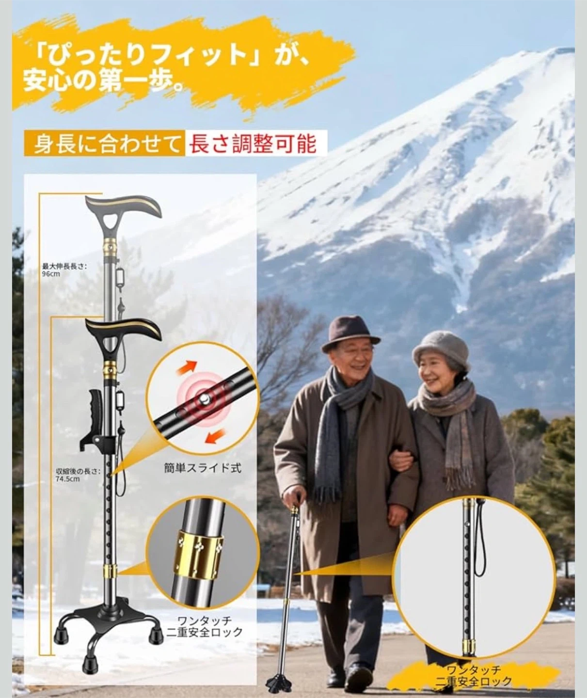 数ある中からご覧頂きありがとうございます(^○^) ◎値下げ交渉◎ ◎コメントなし、即購入大歓迎 ◎送料無料!安心の匿名配送 ★商品説明★ 【革命的な2WAYベース】 屋内户外の全地形対応 √ 連結広幅ベース(室内用)と360°回転ベース(户外用)の2WAY交換可能設計。4点支持で驚異的な安定性を実現。室内では連結広幅ベースが4点支持でがっちり支持し、自立するので荷物の多い時も安定。户外では360°回転ベースが砂利道や不整地でもスムーズな歩行を実現。タイヤ技術応用の高グリップキャップが雨の日のアスファルトや雪道でも安心。一本で屋内户外両用可能な多機能ステッキ。 【充電式LED&100dB警報】 電池交換不要の安全設計 √ 暗い夜道を明るく照らす高輝度LEDライト(角度調節可能)と100dB非常アラームを装備。USB充電式で面倒な電池交換不要、満充電で約30日間使用可能。屋内でも屋外でも、暗い場所でも明るく照らすLEDライト(角度調節可能)で段差や障害物を見落とす心配がありません。緊急時にはボタンを押すだけで約100dBの大音量アラームが鳴動し、周囲に助けを求めることができます。防水加工で悪天候にも強く、高齢者の一人暮らしにも最適。 【立ち上がり補助グリップ】 腰・膝への負担軽減 √ 椅子やベッドからの立ち上がり動作をサポートする専用補助グリップを追加。腕の力で楽に起立可能で、腰や膝への負担を大幅に軽減。リハビリ中の方や力の弱い女性にも最適で、歩行中の握り替えで疲労分散もできます。 【10段階簡単調節&快適グリップ】 身長140-190cmに完全対応 √ スプリング式ボタンで軽く押すだけの10段階高さ調節(74.5-96cm)。身長140-190cmの方にぴったりフィット。ABS素材の滑りにくい人間工学ハンドルは手の形に完璧にフィットし、圧力を分散してマメや痛みを防ぎ、長時間使用でも快適。 【軽量高耐久設計】 贈り物に最適な安心仕様 √ 高強度航空アルミニウム合金採用で軽量(約455g)かつ耐荷重250kg。板厚1.2mmの分厚いパイプで強度と耐久性が格段に向上(耐荷重250kg)。4点式の広いベースとエアサスペンション式の滑り止めキャップにより、静音性とグリップ力を両立。落下防止ストラップ&名札付き。日本語説明書+1年間保証で敬老の日のプレゼントに最適