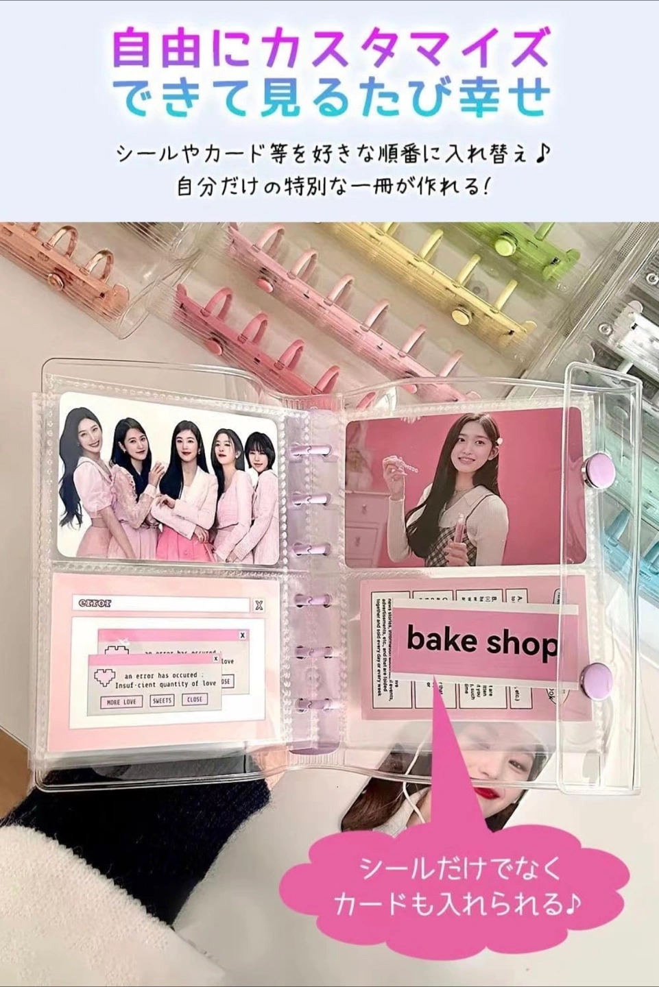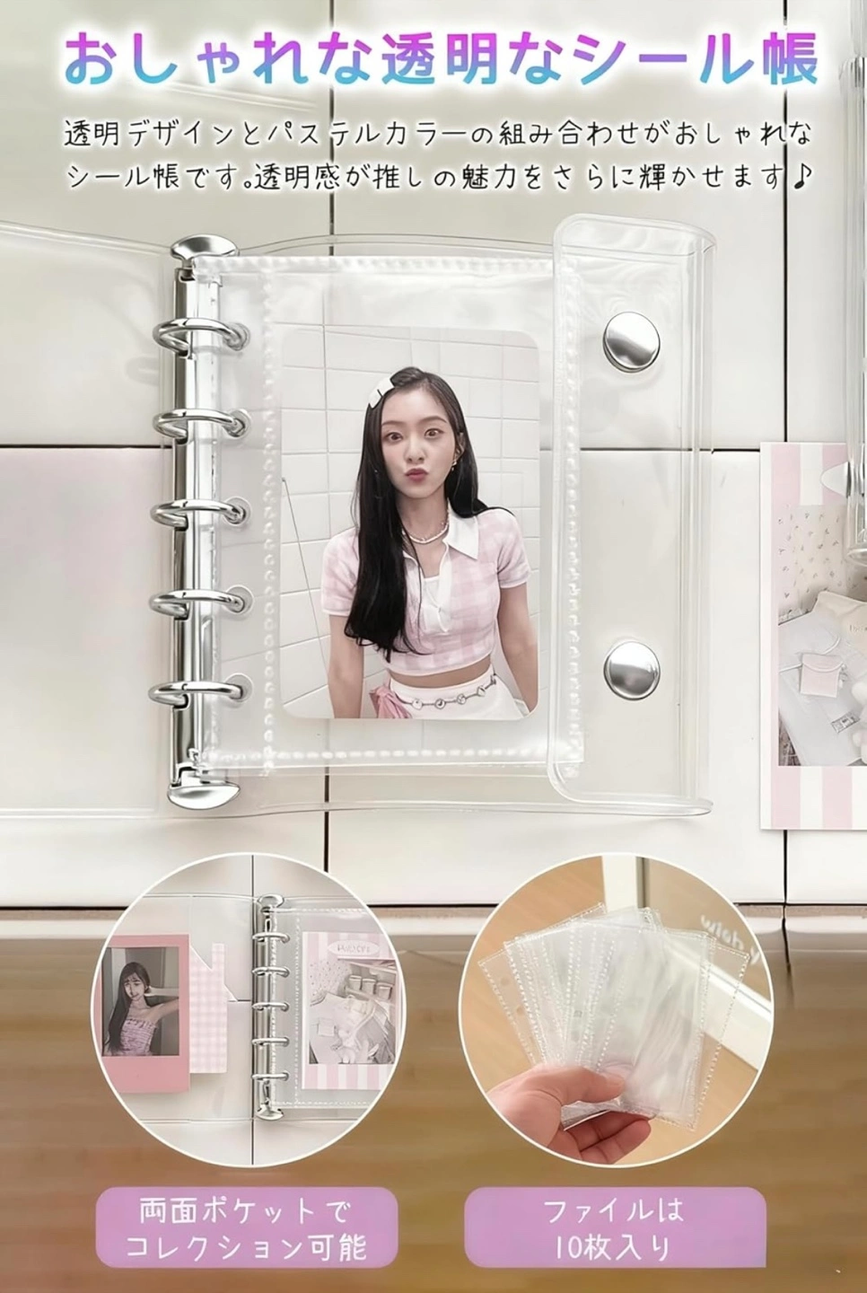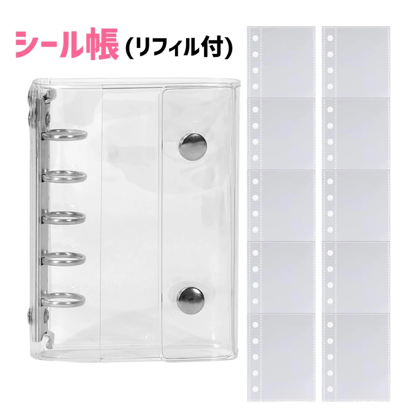 【新品】シール帳 クリア M5サイズ 5穴 ミニバインダー 新品未使用 サイズ:約9.5cm x 12.6cm 素材 : PVC タイプ : 5穴 リフィル付き 今、お子様や推し活界隈で流行っているシール帳。クリアタイプなので、お好みのシールなどでDIYしてあなただけのオリジナルが作れます! ●【すぐ使える透明スリーブ10枚付き】透明リフィル10枚入りですぐ使える! ●シール収納、推し活、カード収納、など