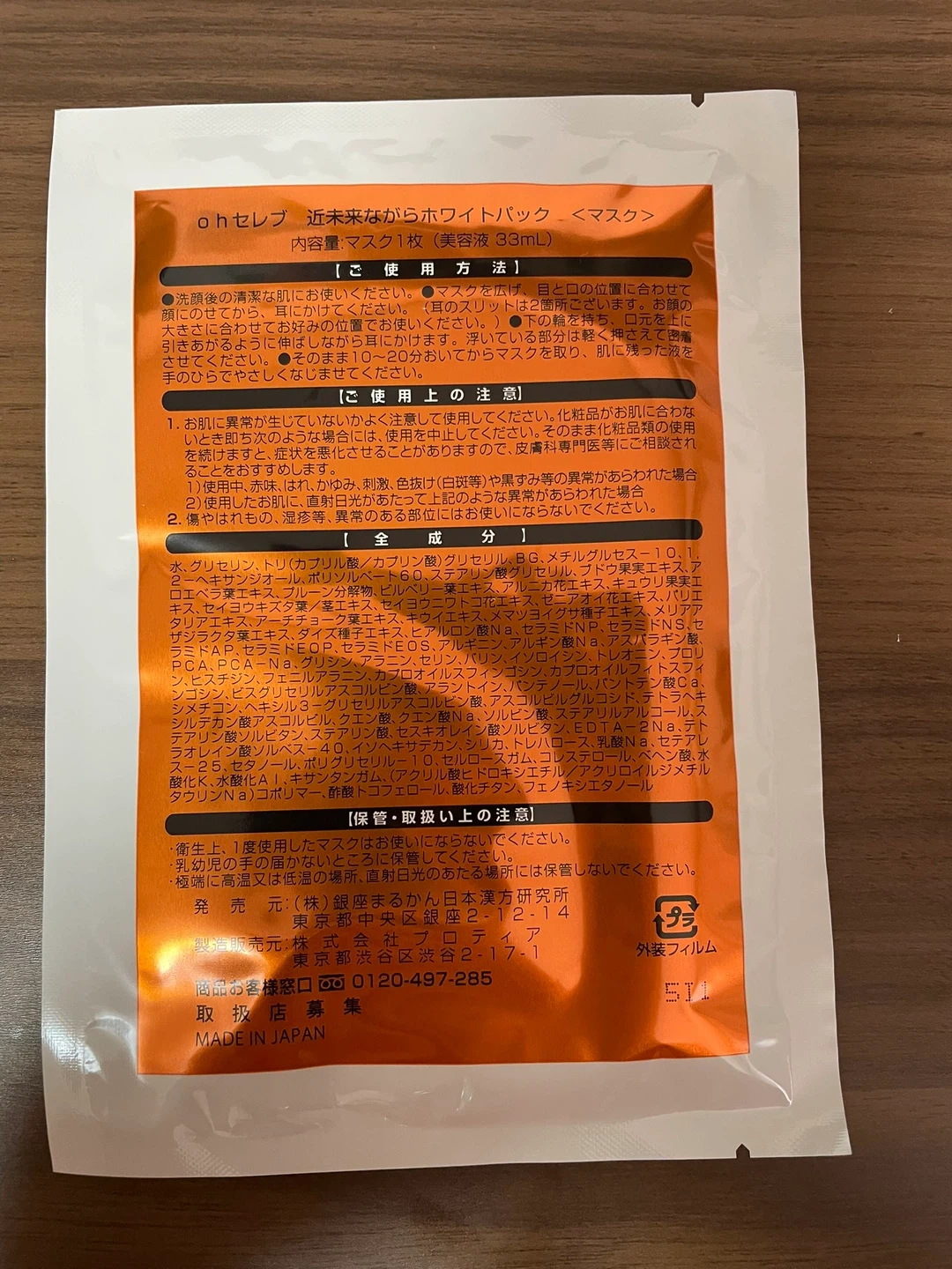 近未来ながらホワイトパックです。 美容液33ml入ったパックです。 パックした次の日の化粧品ノリが凄く良いです。 残りの美容液は体全体につけてもOKです。 付け方 マスクを広げて目と口の位置に合わせて顔に乗せてから耳にかけてください。 耳のスリットは2つあります。お顔の大きさに合わせてお好みの位置にお使いください。 下の輪をもち口元を上に引き上がるように伸ばしながら耳にかけます。 浮いている部分は押さえて密着させてください。 10から20分置いてからマスクを取り肌に残った液を手のひらで優しくなじませてください。 まるかん商品は定価販売の決まりがあります。 ご理解できる方のみお願いします。