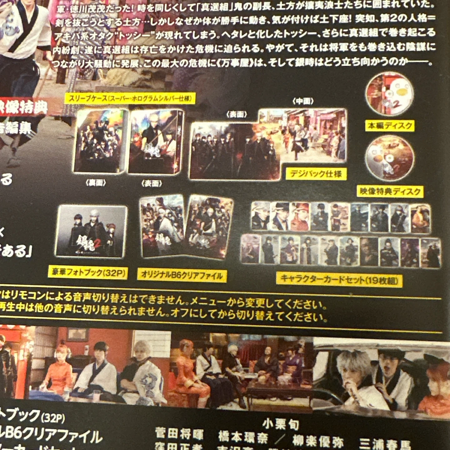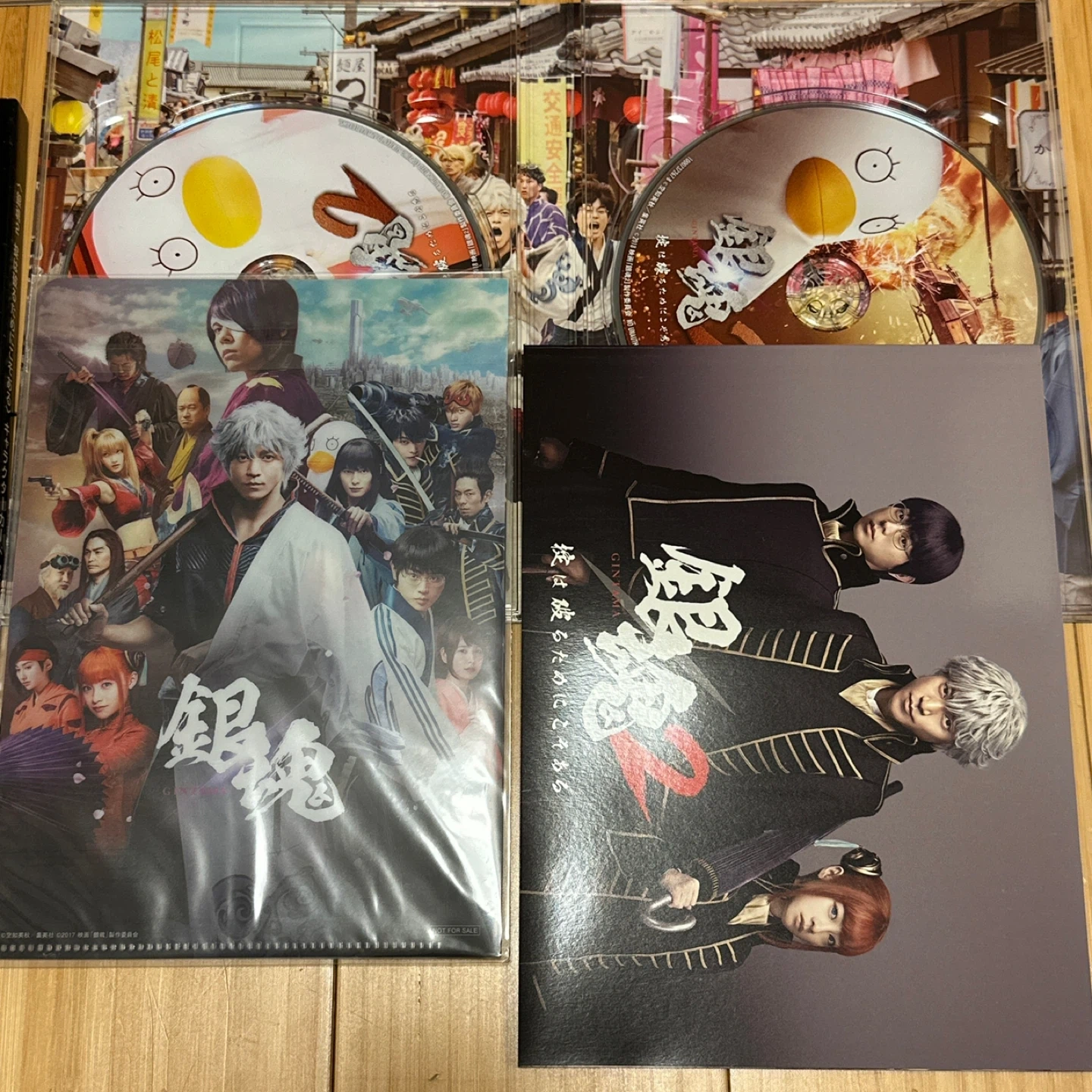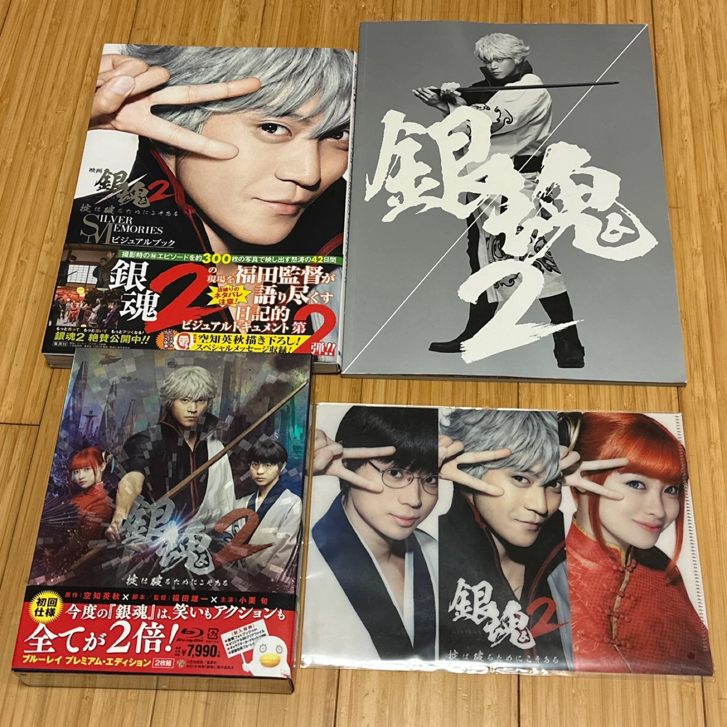 銀魂2の映画関連グッズセットです。 ・映画パンフレット ・ビジュアルブック ・Blu-ray プレミアムエディション ビジュアルブックは撮影期間中のオフショットや出演者のインタビューが掲載されていて、見応えがあります。 (目立った傷などは無し) 映画パンフレットは用語解説などが載っていて、こちらも楽しめる一冊になっています。 (表紙と裏表紙に傷あり) Blu-rayプレミアムエディションは、本編ディスクと特典ディスクに加えてフォトブックやB6クリアファイル、キャラクターカードが封入されています。 (ディスク2回ずつ視聴あり。クリアファイルは未開封。キャラクターカードは吉沢亮、柳 楽優弥、窪田正孝、三浦春馬のカードのみ取り出してケースに入れていましたが、特に目立つ傷などはありません。) 楽天ブックスでBlu-rayを購入した際に付属していたクリアファイル(未開封品)をお付けします。 Blu-rayプレミアムエディションの定価以下でお譲りいたします。 (パンフレット1500円、ビジュアルブック2000円程でしたので、4000円ほどお値下げしてあります。) 小栗旬、菅田将暉、岡田将生、堤真一、長澤まさみなど豪華な出演者が揃っています。 前作を観ていない方でも楽しめる作品なので、良かったらご検討ください。