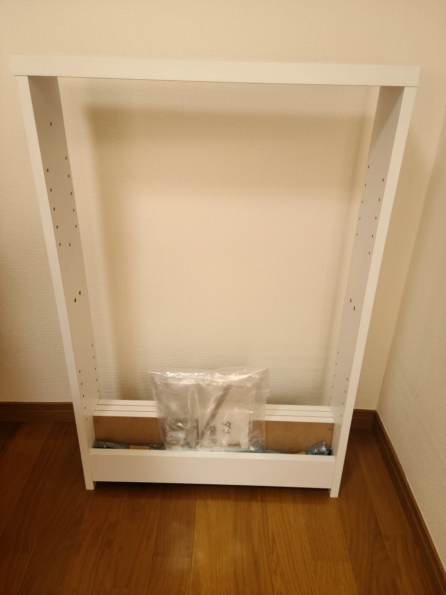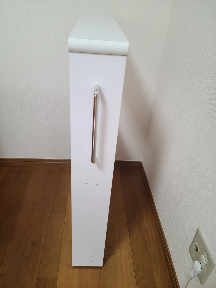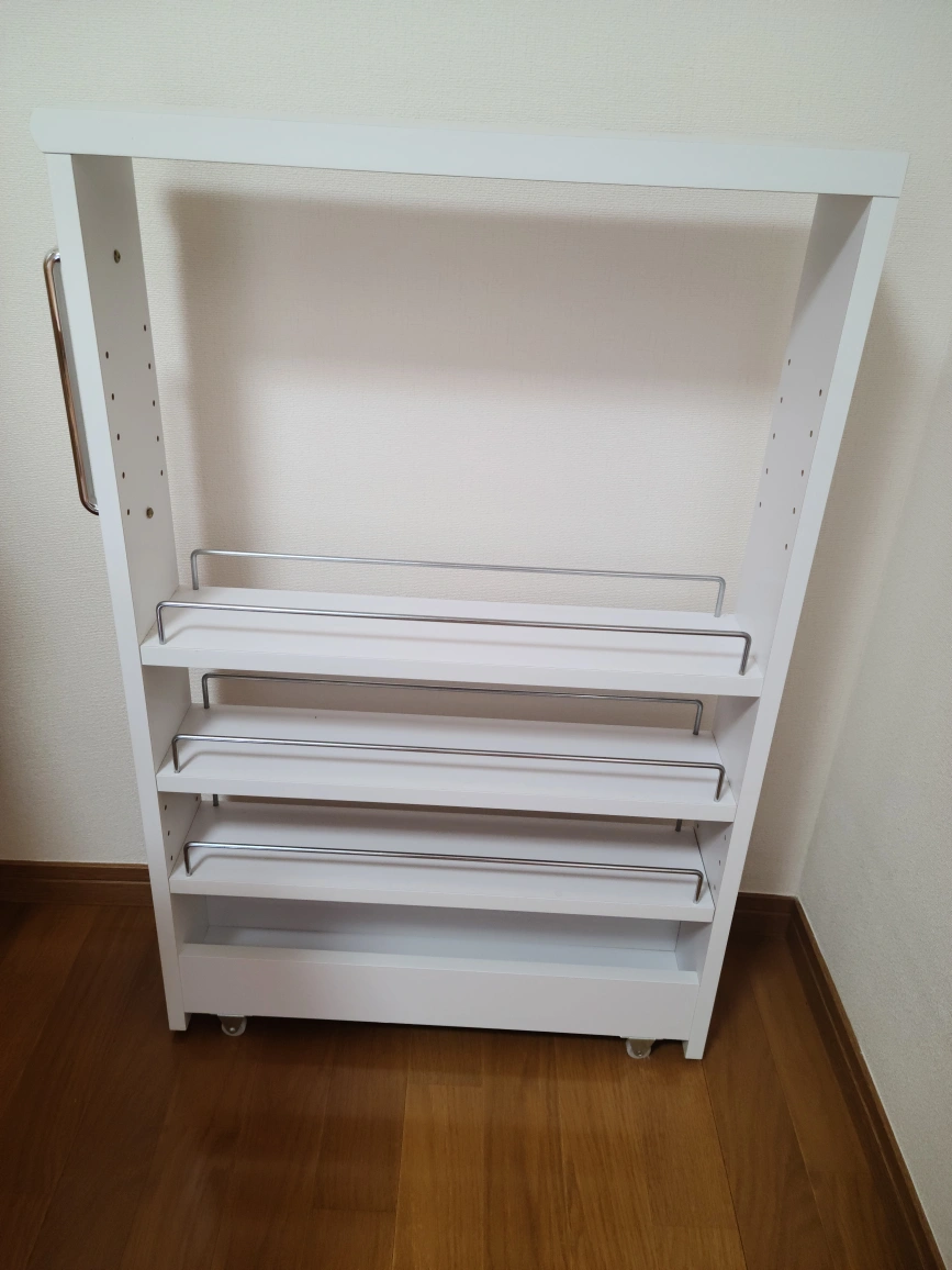 約 12.0×55:5×85.0 キャスター付き。 2021年1月9480円で購入。 あまり人が入らない事務室で新品のストックを飾っていただけなので、大変キレイです。 棚は3段ありますが、一番上が固定で下2段はダボネジで可変。 ディスプレイのしかたを変えたので、こちらは不要となりました。 ばらしても枠はそのまま(3枚目)でしたので、肩にかけて運びはできなくはないけれど、7.8キロあります。 車などでお運びになる方が良いと思います。