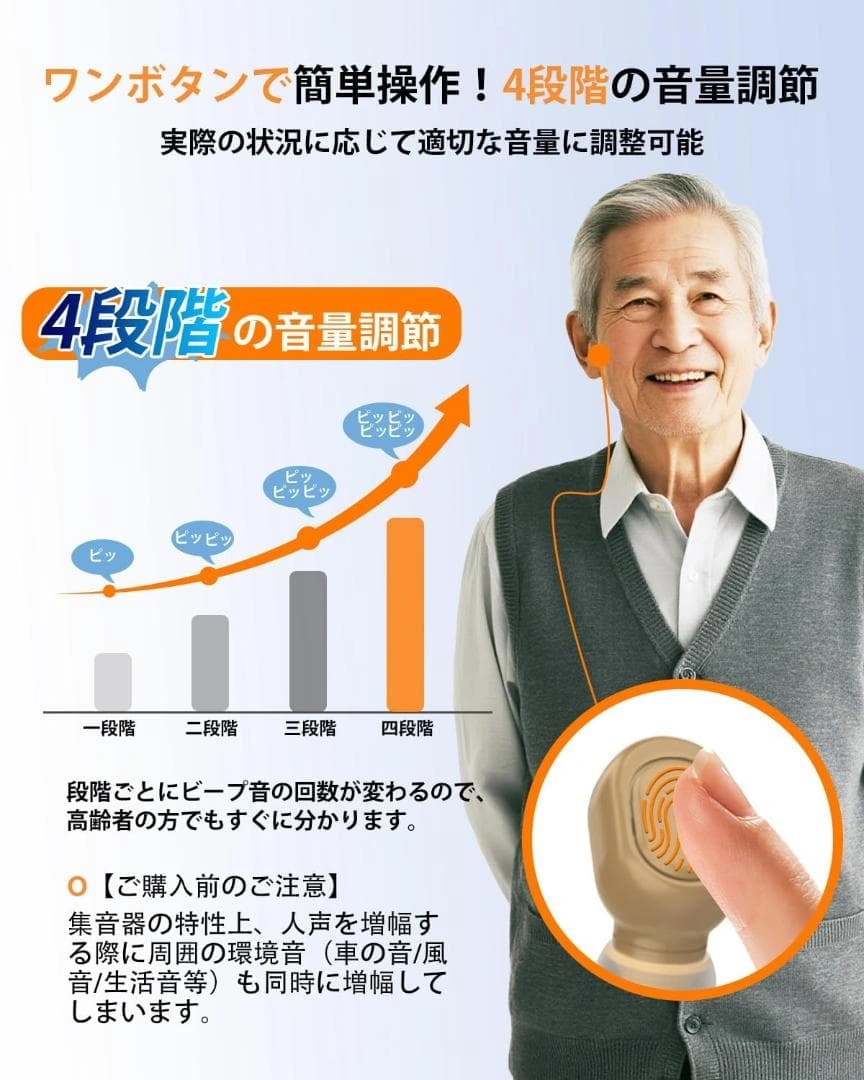 集音器 高齢者 しゅうおんき【2025年革新型 7月新登場 小さい耳にもフィット】 4段階音量調整 簡単操作 音声拡聴器 3.2g軽量設計 コンパクト Type-C充電式 最大20-30時間連続使用可 自動電源ON/OFF 残量表示 300mah充電ケース 人間工学 疲れない 40dB増幅 耳穴型デザイン 敬老の日 誕生日 日本語取扱説明書 (新品未使用 動作未確認) ★撮影為1度開封しております このページを見ていただきありがとうございます。 丁寧な対応を心がけていきたいと思っております ※商品到着後 何か問題がございましたら評価の前に必ずメッセージをください。できる範囲で対応いたします。 個人の不用品でのやり取りになる為メーカーの保証はつきません 商品付属のおまけ特典等への応募もフリマですので対象外となります。 商品受け取り評価後の返品返金等の対応は致しかねます。 コンパクトにする為圧縮袋を使用する可能性が有ります。 ご理解ご了承の程宜しくお願い致します。 【スマート自動ON/OFF機能で操作を簡単に】充電ケースから取り出して耳にかけるだけで8秒後に自動的に電源が入り、使用後はケースに戻せば自動で電源OFF&充電が開始されるスマート設計です。充電中はオレンジランプ点灯し、満充電で消灯。充電ケースの残量はグリーンの数字表示で一目瞭然。煩わしい操作ボタンを押す必要がなく、シンプルで直感的な使い心地を実現しました。 【高齢者にも優しいワンタッチ操作】集音器 高齢者向けのシンプル操作!音量調節ボタンを軽くタッチするだけで4段階の音量調整が可能(レベルごとに回数が変わるビープ音付き)、実際の状況に応じて適切な音量を簡単に設定できます。高性能チップ搭載でノイズを約60%低減しながら、音声を最大40dB増幅! ご希望の方はお気軽にご連絡ください。
