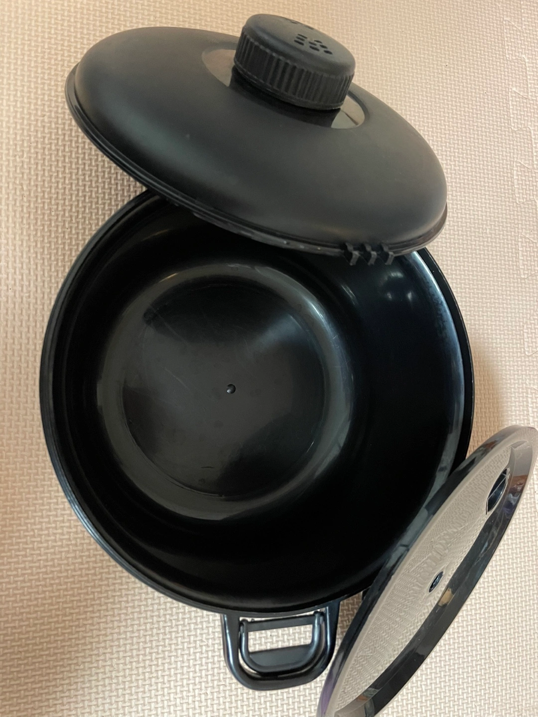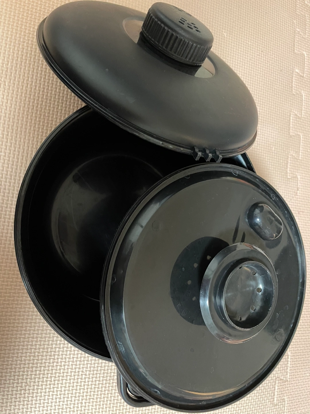 レンジDE Cookマスター 電子レンジ専用調理器 直径20cm、高さ10cmの電子レンジ調理器です。 以前使っていたのですが、使わなくなったため出品します。 内蓋付きで蒸気が抜ける蓋となっており、ご飯が炊けたり、蒸し物もできます。 電子レンジがあればこれ一つで調理の幅が広がります。 なんと、ご飯もレンジで炊ける優れもの!温野菜や料理の下ごしらえにも大活躍! 材料をそのまま本体に入れて電子レンジの中へ。簡単調理でおいしくヘルシーな料理ができます。 よろしくお願いします。 カラー···ブラック 種類···電子レンジ用炊飯器 素材···プラスチック 対応加熱機器···電子レンジ対応 サイズ···大