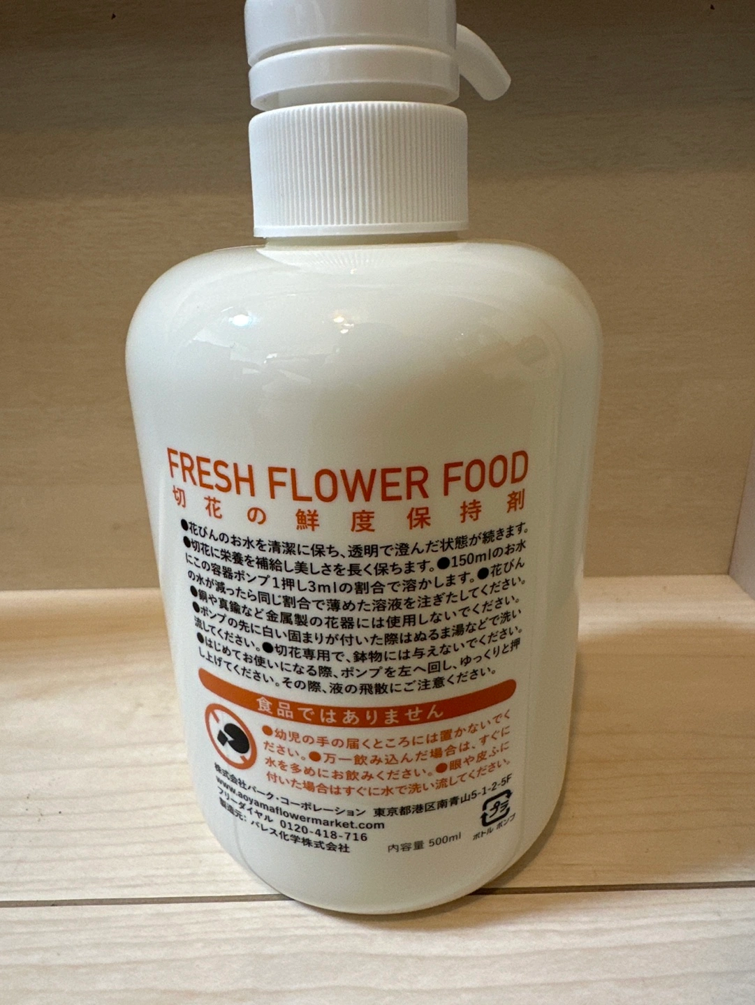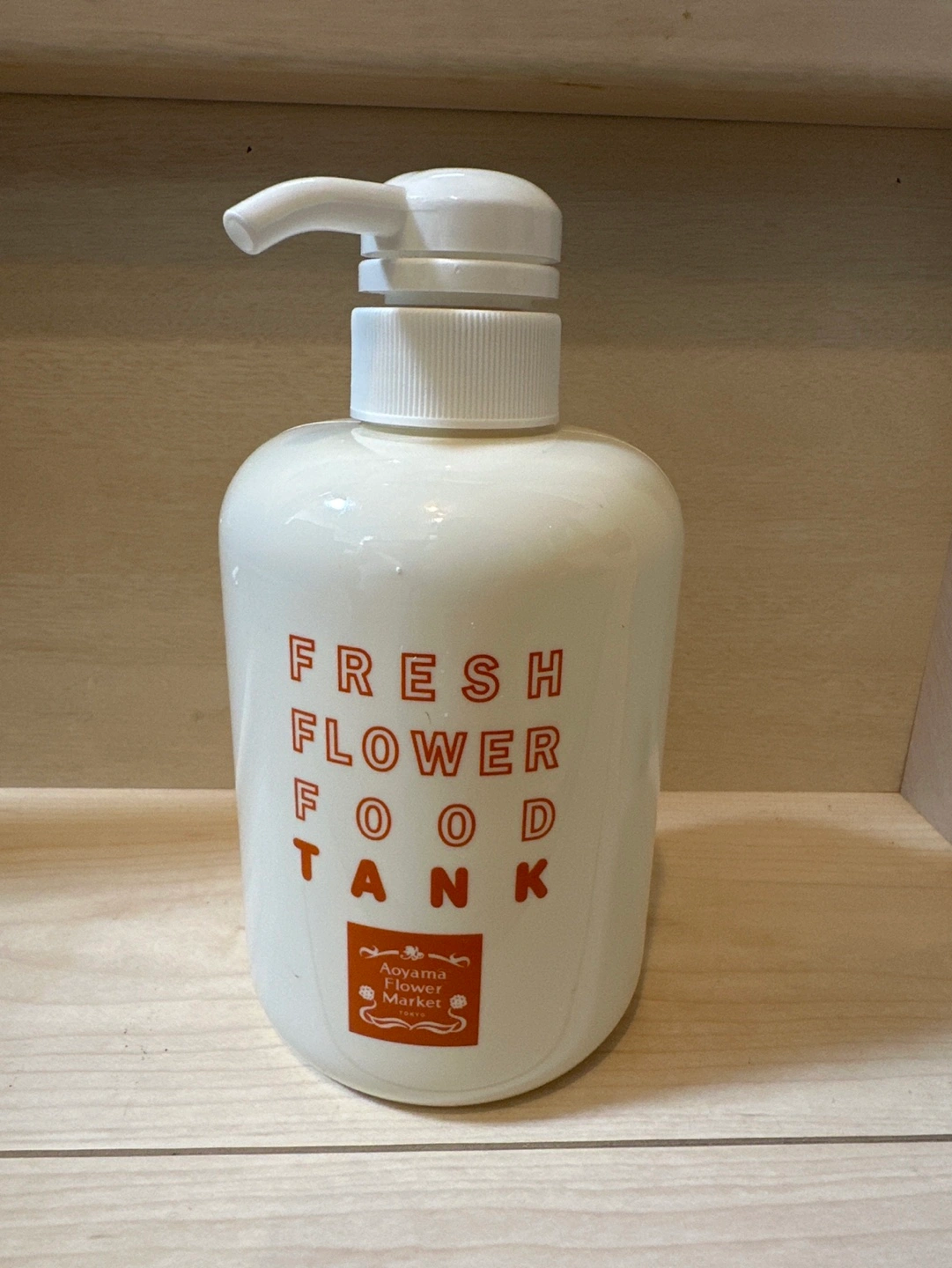 ご覧頂きありがとうございます♪ 新品 未開封 青山フラワーマーケット フレッシュフラワーフード 500mlタンク(切花鮮度保持剤) お水に溶かすだけで花びんのお水を清潔に保ち、透明で澄んだ状態を持続してくれます。 また、お水に溶かすだけでお花に栄養を補給し、お花の美しさを長く保ちます。 ■花を咲かせるため必要不可欠なものは、きれいなお水。そして糖分。 本来植物は根っこから吸い上げたお水と太陽の光を使って光合成を行い、成長に必要な栄養源、糖分(ブドウ糖)を作ります。 しかし、切花は光合成をすることが難しいため、自分で糖分を作り出すことができず、鉢植えの花よりも寿命が短くなってしまいます。 フレッシュフラワーフードには植物の成長を促すための糖分が入っているため、真水で活けるよりもより長い間、花の美しさを楽しむことができます。 ■でもただ、糖分が入っていればいいというわけではありません。 糖分だけでは逆にバクテリアの繁殖を促し、水の傷みが進んでしまいます。 それを防ぐために、水をきれいに保つための防腐剤も配合されています。 そのため、水替えの必要はほとんどなく、より長くお花を咲かせることができるのです。 原材料:ブドウ糖・硝酸マグネシウム・腐敗防止剤 150mlのお水にポンプ1押し3mlの割合で溶かしてお使いください。 あくまで自宅保管ですので完璧を求める方は店舗で定価にてご購入ください。 他のサイトにも出品しておりますので早い者勝ちです!
