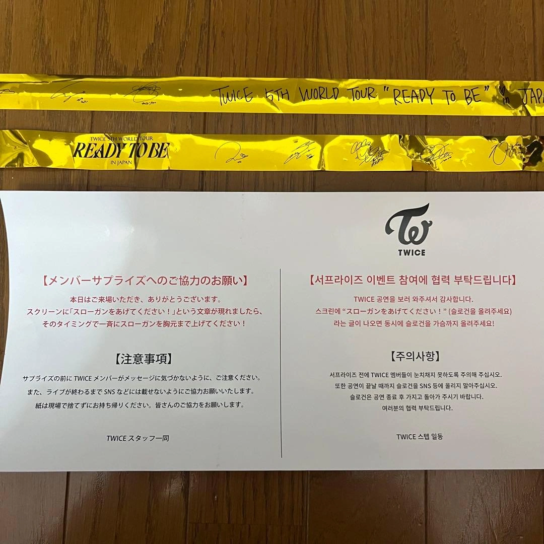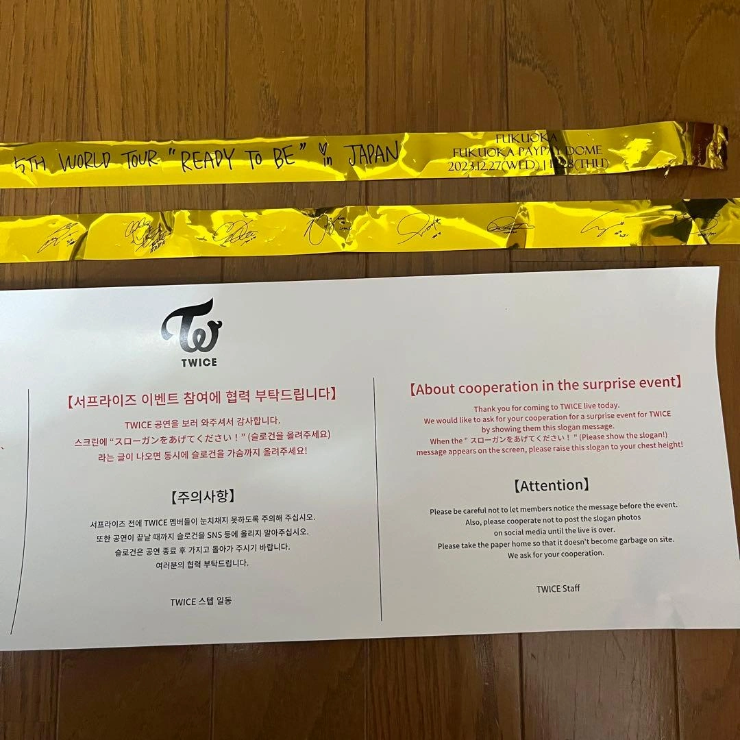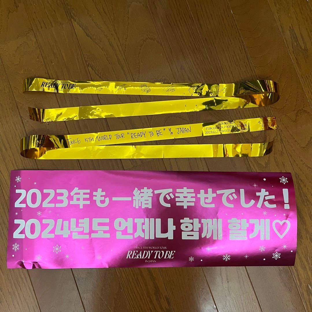 【非売品】TWICE ライブ2023 12/28福岡公演グッズ スローガン ・2023/12/27•28公演の金テープ 2枚 ・2023/12/28公演のみ配布のサプライズメッセージスローガン 金テープにはメンバー全員のサインが入ってます! 持ち帰り時の折れなど多少あります。 ご希望の方はお気軽にご連絡ください。