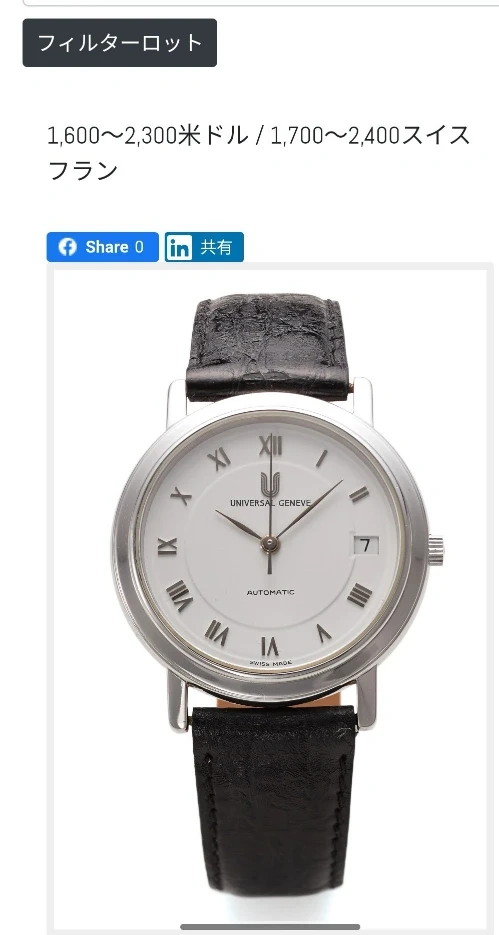 ★★ 非常に希少な名品。 日本では殆ど出回りません。 ★★ UNIVERSAL GENEVE ユニバーサルジュネーブ クラシック ホワイトローマン 自動巻きデイト  SSケース 腕時計。 型番 862.1604 正確作動 日差±約5秒程 ★★ 参考写真はPtケースでの海外での中古取引価格 約 2000スイスフラン(約388.000円) SSケースでも約1200スイスフラン(233.000円) こちらは殆ど欧米で取引される時計の為、日本では殆ど出回りません。 モチロン現在中古市場には1つも出てません。 ★★ 非常に美しいフォルムにホワイト文字盤も 腕元に映えるクラシックな腕時計です。 写真の通り非常に綺麗な状態ですが、 ストラップが純正のままで使用してますので、使用感が有りますがご容赦願います。 ★★ 腕周り フリー color シルバー&ホワイト こちらは現物のみとなります。 ★★