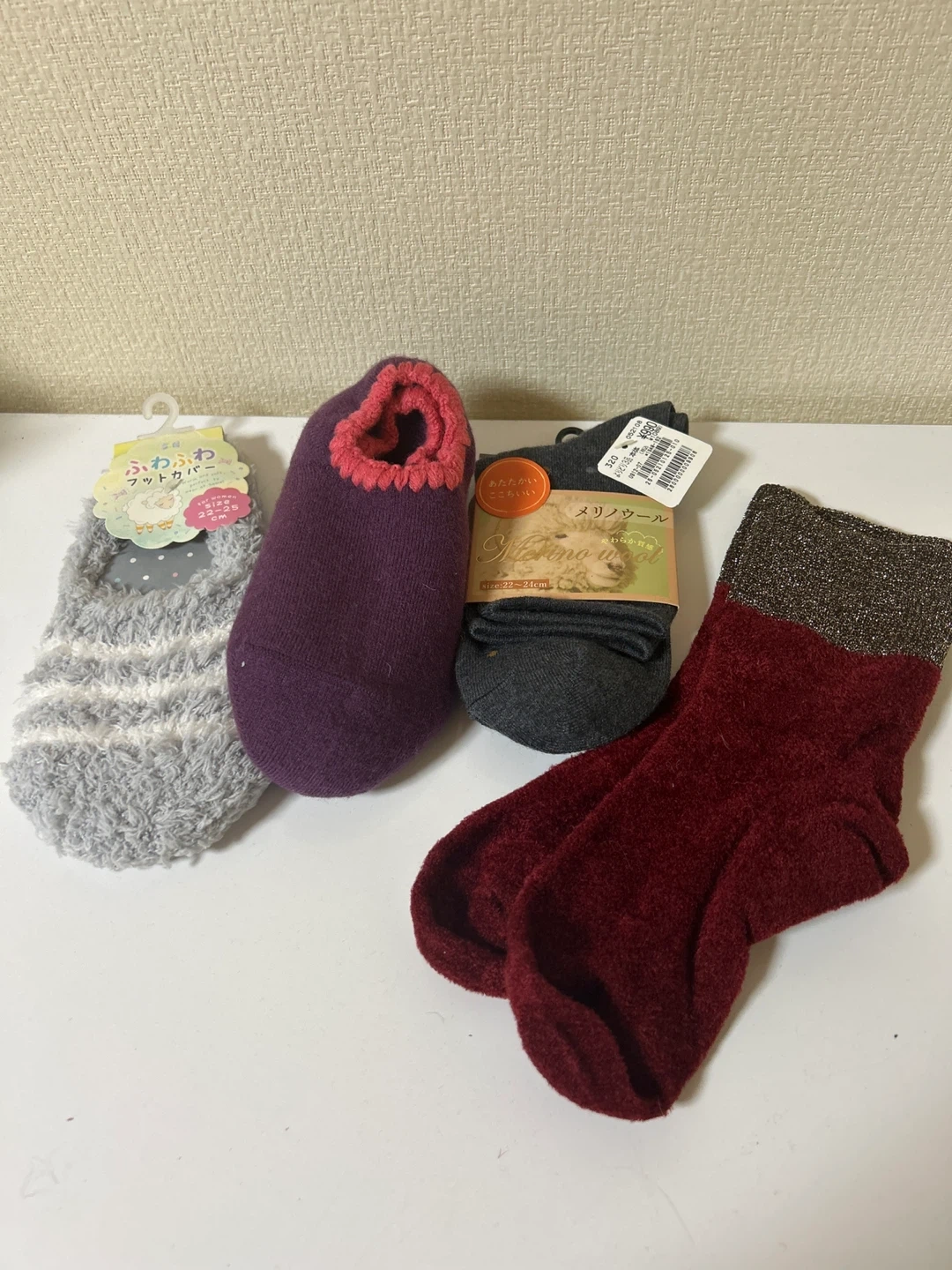 靴下4足セットです。 グレーストライプとパープルピンクステッチのフットカバー左2足はルームソックスです モコモコでかなり暖かいと思います♪ チャコールグレーのソックスはグレーとブラウンの水玉模様です エンジのソックスも少し厚めの暖かく触り心地の良い生地で履き口にはラメが施されております✨ 22〜24cmの方が最適 全て未使用品ですが2足開封済みで 自宅保管につき神経質な方はご遠慮ください✨