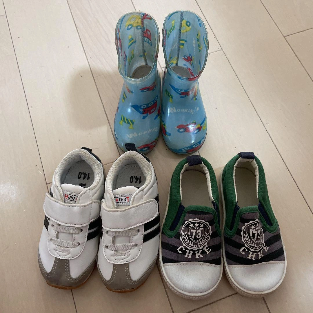 中古品です。 使用感があります。 長年保管してありました。 まだ履けると思います。 長靴が少しベタつきがあります。 靴 サイズ 14cm ・スニーカー 白黒 ・スリッポン 緑 長靴 サイズ 13cm 柄は働く車です。(クレーン車、コンクリートミキサー車など) 中古品ですのでご理解頂ける方のみお願いします。 ご希望の方はお気軽にご連絡ください。
