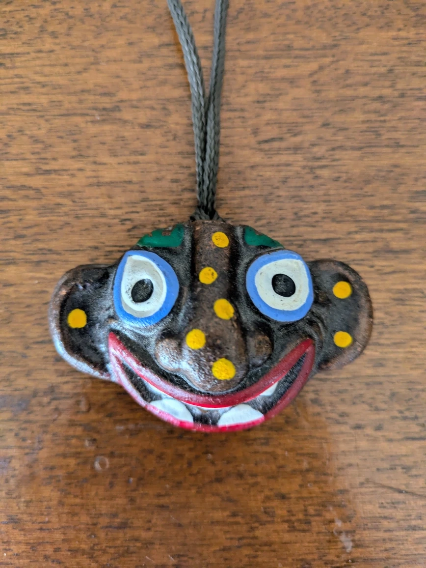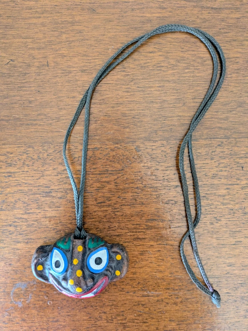 25年位前に、韓国で購入した民芸品、お面のお守り?ネックレス?です。 家の守神みたいなものでしょうか?? ひもの長さは42cmくらい、 お面は縦4.5cm、横7cm、厚み2.5cmくらいです。 お面の材質は陶器だと思います。 中古品であることをご了承ください。