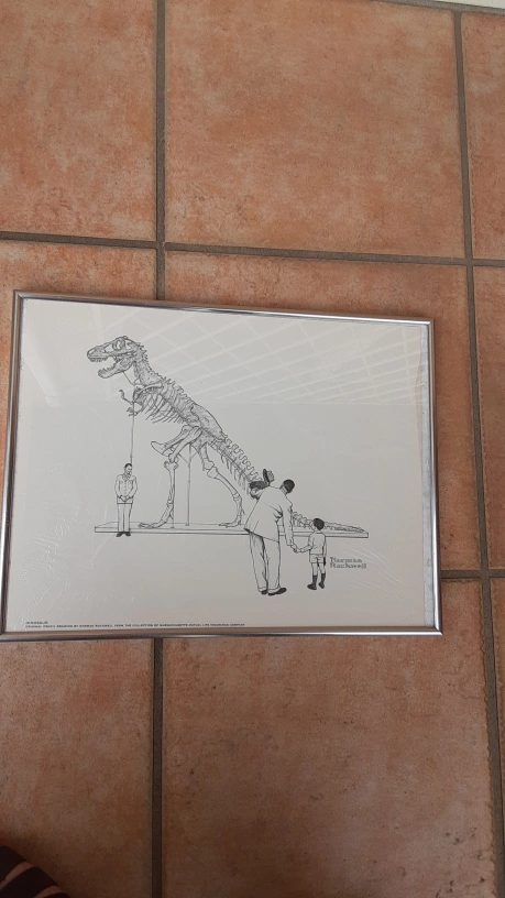 若いケネディが、幼い息子に説明しながら、恐竜の化石を見ているデッサンをプリントしたものらしい。ケネディ大統領の肖像画で、アメリカのライフ誌表紙を飾って人気の、ノーマン ロックウェルのミュージアム(マサチューセッツ洲)で入手したものです。 やや、黄ばんでいます。 実物をよくご覧になって納得されたらお願いします。無理強いはしません。バス23系「萱場公園入口」近くです。