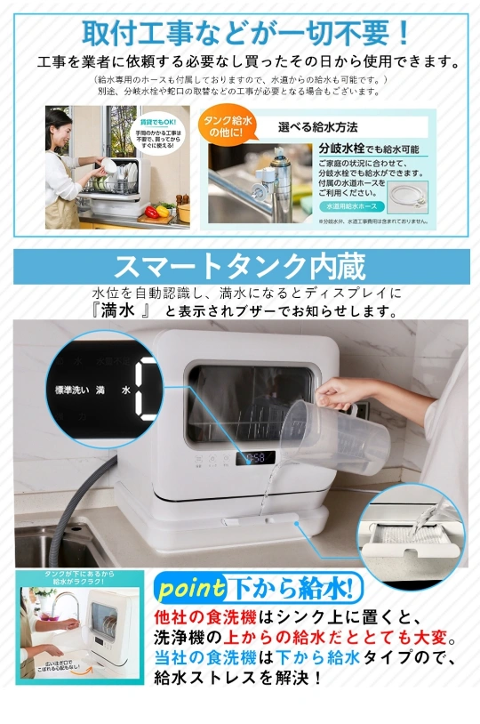 2023年秋に購入し、ほぼ毎日使っておりました! 非常に綺麗に落ちるし、節水もできます! この度引越しに伴い出品することとなりました 正常に動作します! 簡易的な清掃は行っておりますが素人清掃の為ご了承ください。 発送は三月末を予定しております! 中古品ということをご理解の上でご検討ください。 ブランド VIBMI 設置タイプ 工事不要 商品の寸法 41.3D x 45W x 49H cm 容量 7.5 L 特徴 タンク式 色 ブラック 【もはや一家に一台食洗機の時代】 ●仕事を終えた後の限られた時間で、いかに効率的に家事と育児を両立するか?共働き家庭にしては食器洗い機が役に立っています!家事の中から食器洗いという作業が消えることで、どちら食器洗いをするかで揉めることがなくなります。放って置けば皿洗い完了は非常に便利。 【手洗いより綺麗・工事不要】 ●食洗機D4Pは、食器点数16点(3~4人分)を一度に入れられます。70度高温の洗浄水と360°回転式プラネットアームの2つの強力な噴射、また使用する洗剤も洗浄力が高いので、納豆の粘りや肉炒めの油汚れもしっかり落ちます。●スポンジが届きにくい細かい部分まで綺麗に洗うことができ、99%以上の除菌が実証されました。 特に気を使いたい赤ちゃんの食器、綺麗に洗えるのは安心です。●食洗機D4Pは、水道工事が不要で、タンクに水を注いで使えます。わざわざ業者に依頼しなくても自分で手軽に設置できる!電源と排水できる場所があればどこでも置けます。(専用給水ホース付属するので、分岐水栓にも対応しています。) 【3D熱風乾燥機能・24時間のドライキープ】 ●せっかく洗った食器に、菌を付ける?手洗いした食器を拭くふきんに、何らかの雑菌は存在しますので、食器を介して食物に病源体が移る可能です。●食洗機D4Pは、洗浄後の熱風送風乾燥により、食器を乾いた状態に保つ、バクテリアを効果的に抑制できます。●洗って終わったら、庫内からすぐに取り出さなくてもいいです。24時間のドライキープにより、保管期間は、定期的な換気と乾燥を行い、食器を常に清潔で乾いた状態に保ち、機械の臭いを防ぎます。 #食洗機 #食洗器 #食器洗い乾燥機 #タンク式 #乾燥機 #時短家電