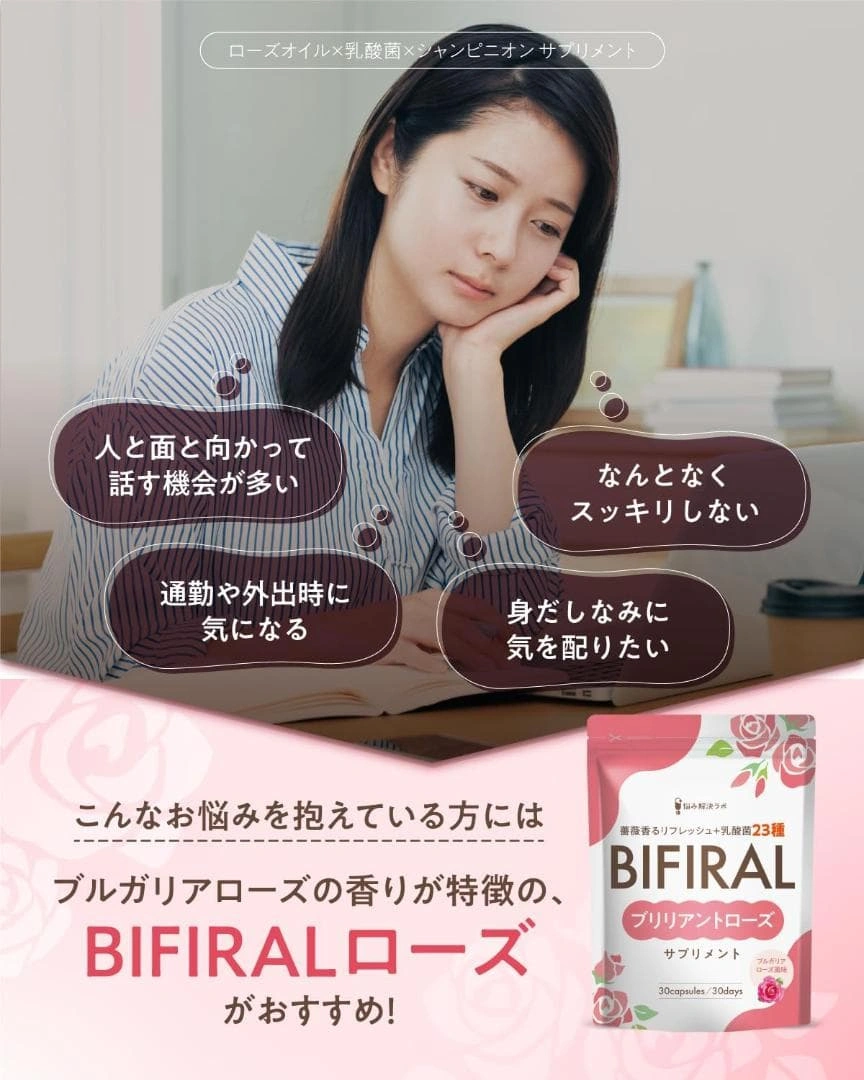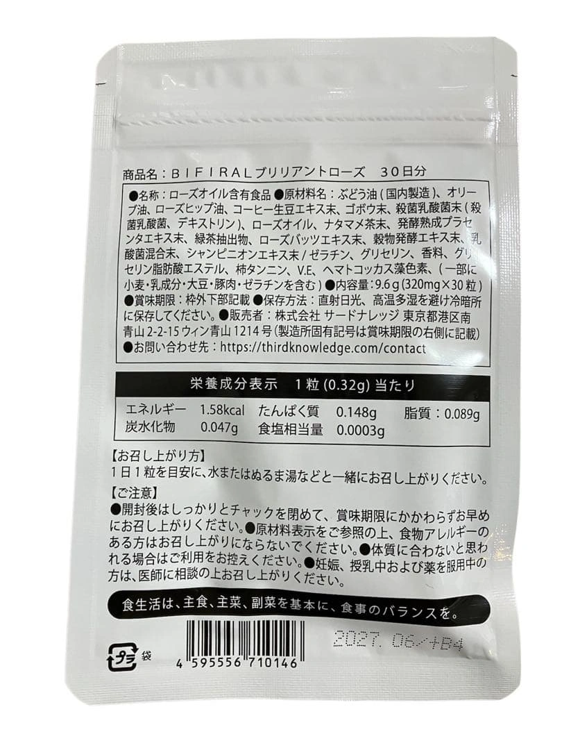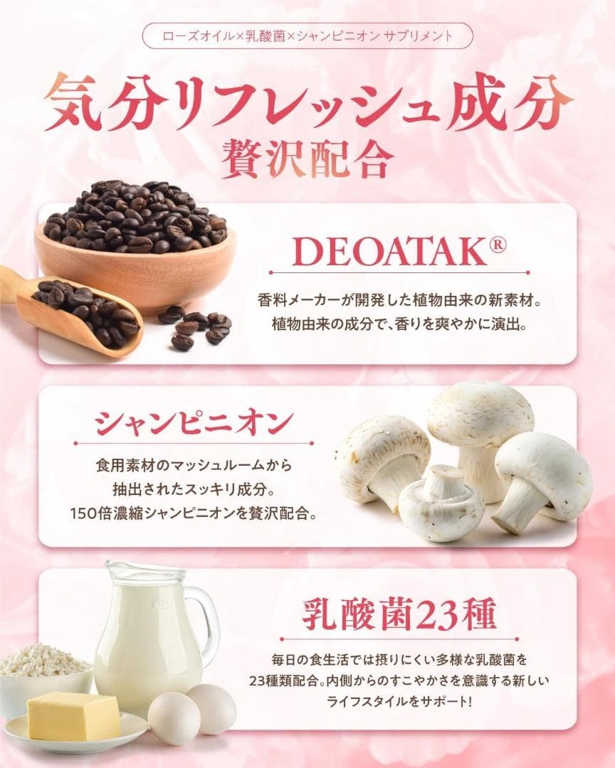 ご覧いただきありがとうございます。 賞味期限2027.06 内側からバラ香るエチケットケアサプリメントです。天然ローズオイルをはじめ、シャンピニオン、白ナタマメ、乳酸菌など配合。 内容量:30粒(約30日分) お召し上がり方法:1日1粒を目安に、水またはぬるま湯でお召し上がりください。 保管方法:直射日光・高温多湿の場所を避けて保管してください。 原材料名:ぶどう油(国内製造)、オリーブ油、ローズヒップ油、コーヒー生豆エキス末、ゴボウ末、殺菌乳酸菌末(殺菌乳酸菌、デキストリン)、ローズオイル、ナタマメ茶末、発酵熟成プラセンタエキス末、緑茶抽出物、ローズバッツエキス末、穀物発酵エキス末、乳酸菌混合末、シャンピニオンエキス末/ゼラチン、グリセリン、香料、グリセリン脂肪酸エステル、柿タンニン、V.E、ヘマトコッカス藻色素、(一部に小麦・乳成分・大豆・豚肉・ゼラチンを含む) MADE IN JAPAN ご希望の方はお気軽にご連絡ください。