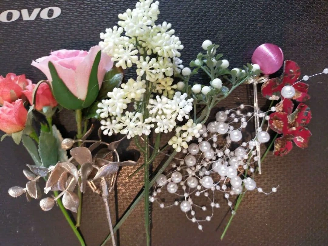 薔薇 ピンク1、オレンジ×2 パールチェーン金飾りヘアピン 金の枝葉様ピック 白小花ピック 白木の実ピック 和模様布小花ピック×2 ピンク絹糸鞠ピック ピックはそのまま刺すか、U字型に曲げて髪に刺すかして下さい。 長さをペンチで切って調整することが出来ます。 ご希望の方はお気軽にご連絡ください。