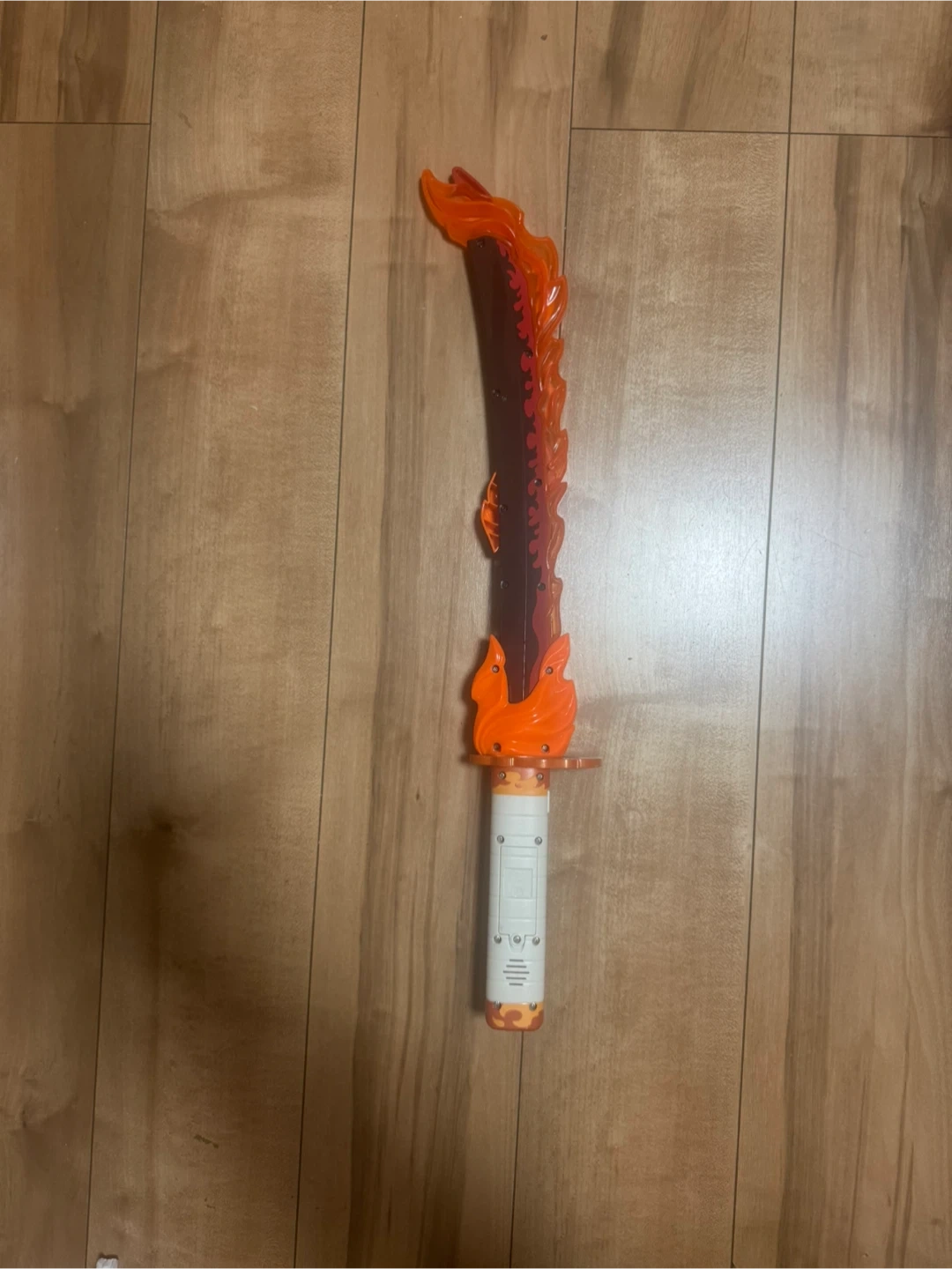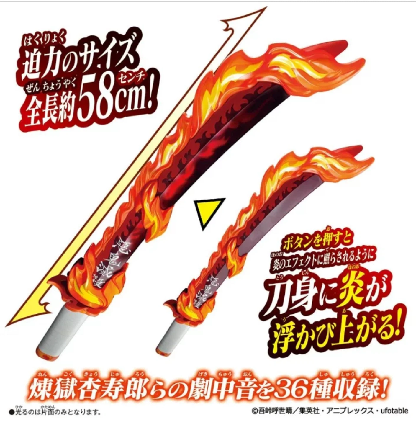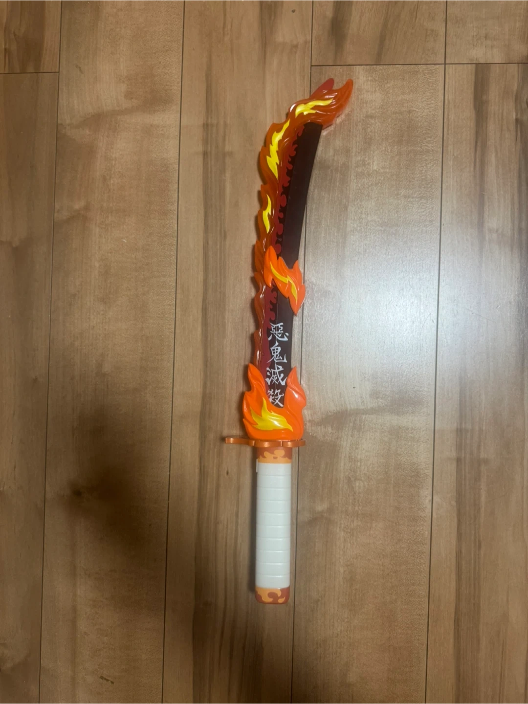 鬼滅の刃 煉獄杏寿郎の日輪刀です。 ・全長約58cm ・ボタンを押すと刀身に炎が浮かび上がる ・煉獄杏寿郎の劇中音を36種類収録 中古品であることご了承ください