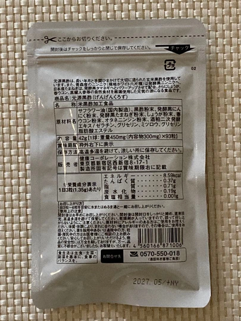 黒酢サプリメント 元源黒酢 42g 93粒入り、賞味期限は2027年5月です。 定価 1,944円(税込) 42g(1球:重量450mg(内容物300mg)×93粒 国産の米黒酢と玄米抽出物からつくられた黒酢粉末を使用。アミノ酸や有機酸、ミネラルが健康をサポートします。 活力食材として発酵黒にんにく、発酵黒たまねぎ、春ウコン、高麗人参、生姜、酒粕発酵エキスが配合されています。 ご希望の方はお気軽にご連絡ください。