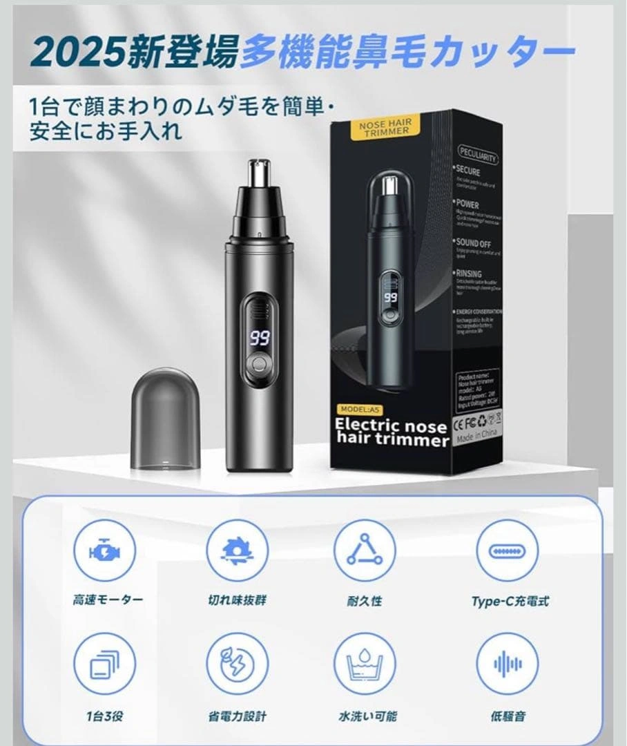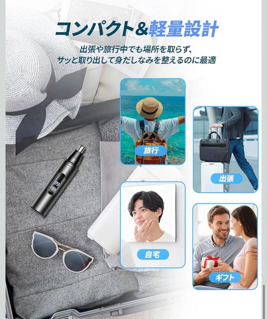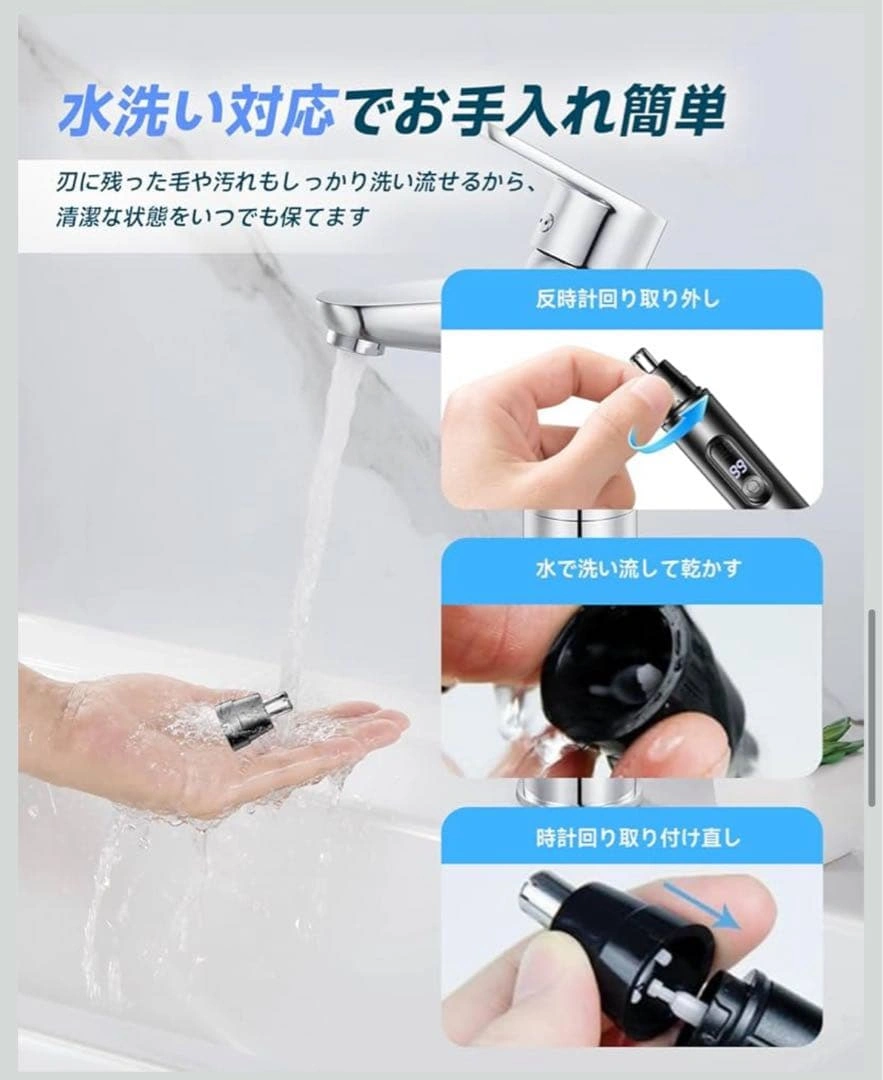 数ある中からご覧頂きありがとうございます(^○^) 【パワフルな回転刃で鼻毛も耳毛も素早く整える】高精度ステンレス製の回転刃を360°に配置した鼻毛カッターは、あらゆる方向に生える鼻毛や耳毛をスムーズに処理できます。円形の刃先が直接肌に触れにくく、痛みや不快感を感じにくい安心設計です。さらに、強力なモーターの回転力により太めの毛でも引っかかりにくく、短時間で清潔感のある仕上がりを実現。朝の支度や外出前の限られた時間でも、エチケットケアを気軽に習慣化できます。 【USB充電式で出張や旅行にも便利】はな毛カッターはUSB充電に対応しており、スマートフォンやPCと同じケーブルで手軽に充電できます。自宅はもちろん、職場や旅行先でもモバイルバッテリーから素早く充電できるため、急な予定にも安心して対応可能です。一度のフル充電で長時間使用できる省エネ設計で、ビジネスパーソンの出張や旅行のお供に最適です。煩わしい電池交換の手間がなく、日常の身だしなみケアをより効率的にサポートします。 【静音設計&コンパクトで持ち運びラクラク】本体は軽量かつスリムなデザインで、ポケットや小さなポーチに簡単に収納できます。さらに、作動音を抑えた静音設計により、早朝や夜間でも周囲に気を遣わずに使用できるのが魅力です。オフィスや出張先のホテルでも気軽に使え、急な会議や食事の前でも清潔感をすぐに整えられます。男性はもちろん、女性の眉毛や細かい産毛の処理にも活躍し、幅広い世代が安心して携帯できる多機能シェーバーです。 【水洗い可能でいつも清潔に保てる】使用後の鼻毛カッターヘッドはワンタッチで取り外せ、流水でサッと洗えるため、毛くずや皮脂汚れを簡単に落とせます。さらに付属のクリーニングブラシで細部まで清掃でき、常に衛生的な状態を保つことが可能です。防塵カバーも備わっているため、収納中のホコリや汚れから刃先を守り、長く快適に使用できます。肌に直接触れる製品だからこそ、清潔を保ちやすい構造が安心感を高め、日常のグルーミングを心地よくサポートします。