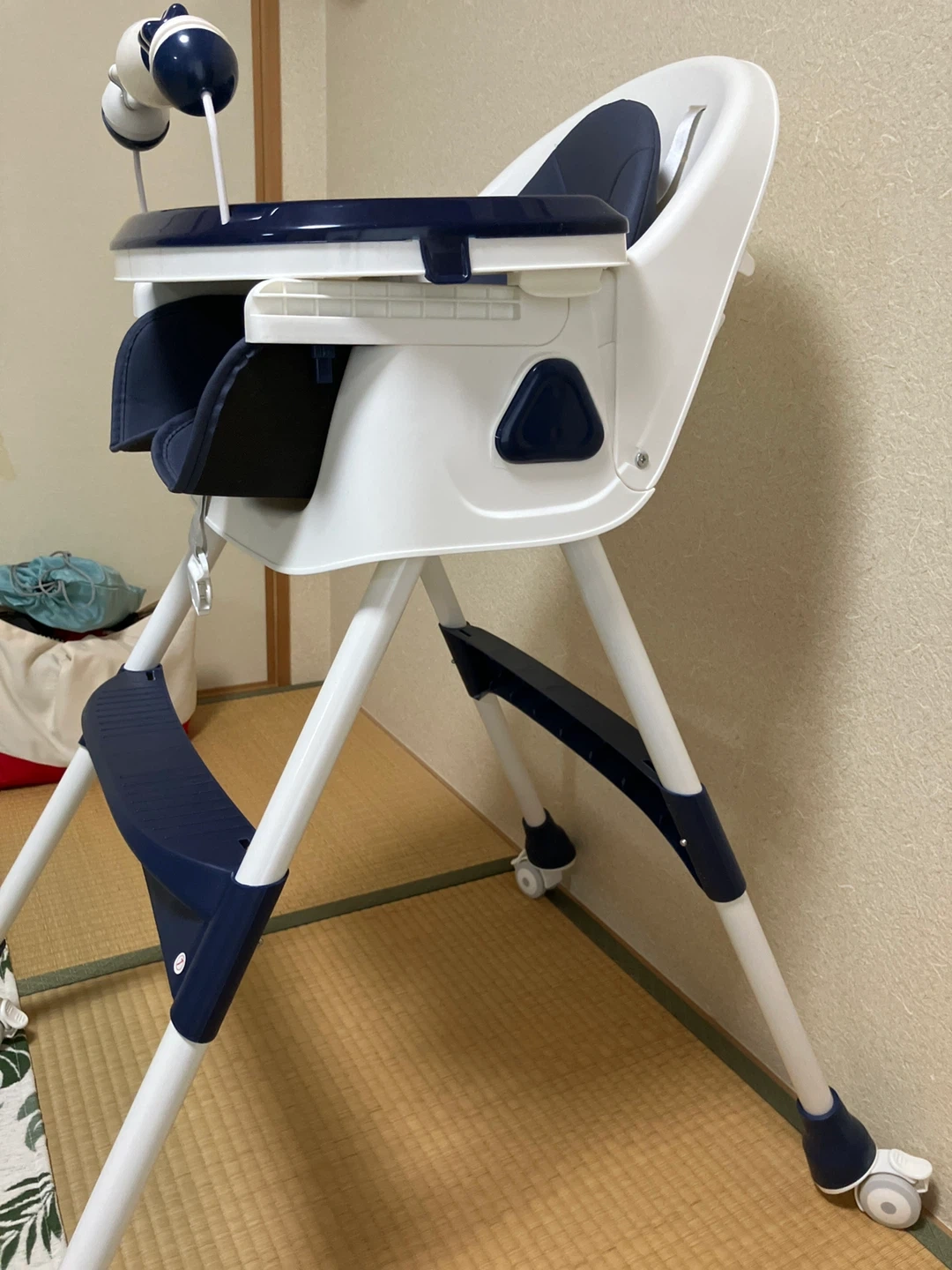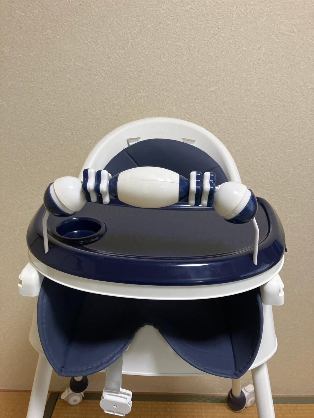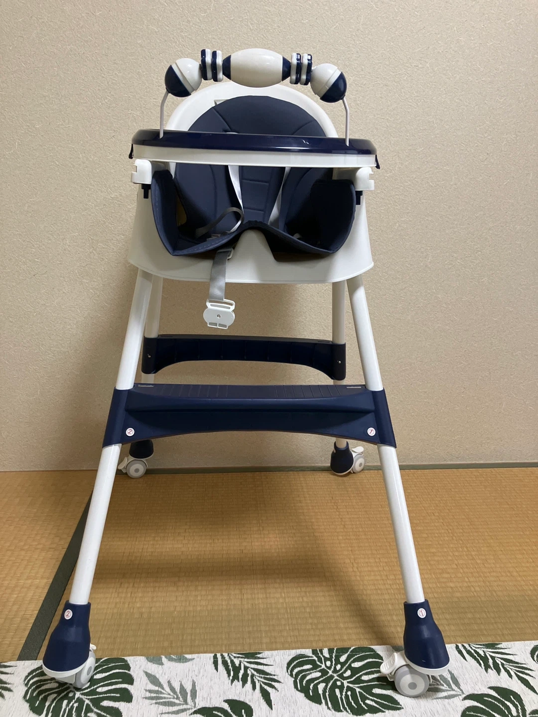 ベビーハイチェアです ・カラー:白、紺 ・状態:使用感少なめ ・全体的にきれい ご不明点があればお気軽にご連絡ください 購入して、1、2回使用しましたが、違うタイプの椅子を気に入りほぼ使用せずになってしまいましたので、どなたかにお譲りします。 使ってくださる方を探しています。おもちゃもついています。テーブル、おもちゃは取り外し可能です。 足も縮み引くなります。
