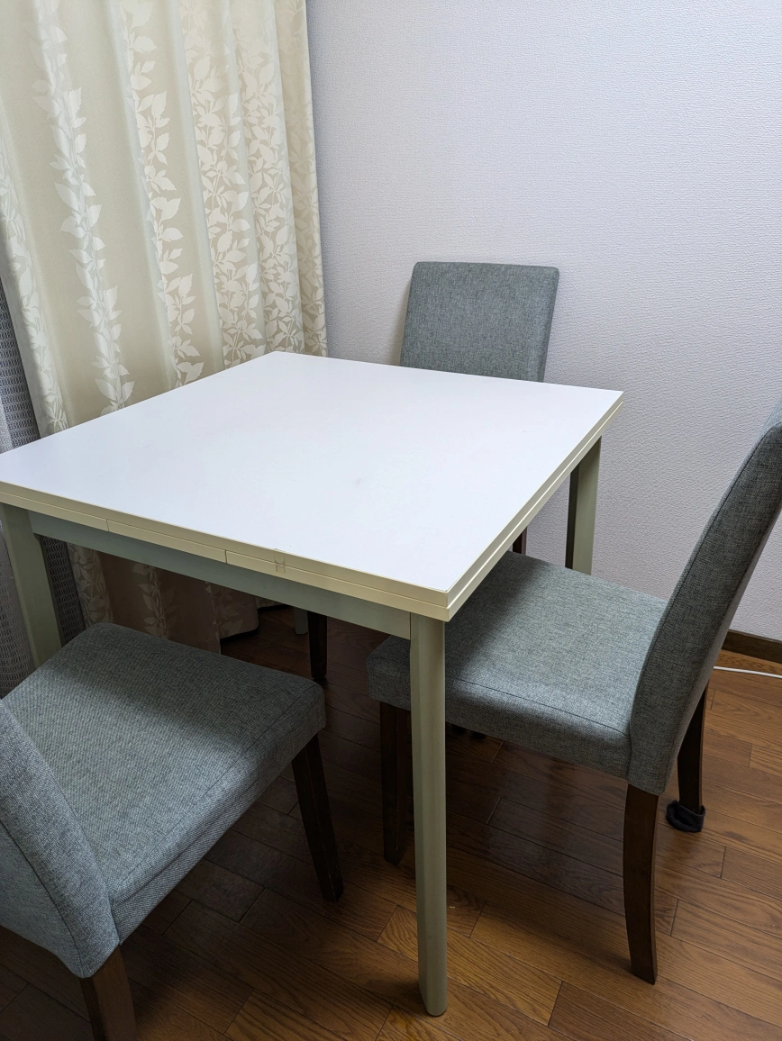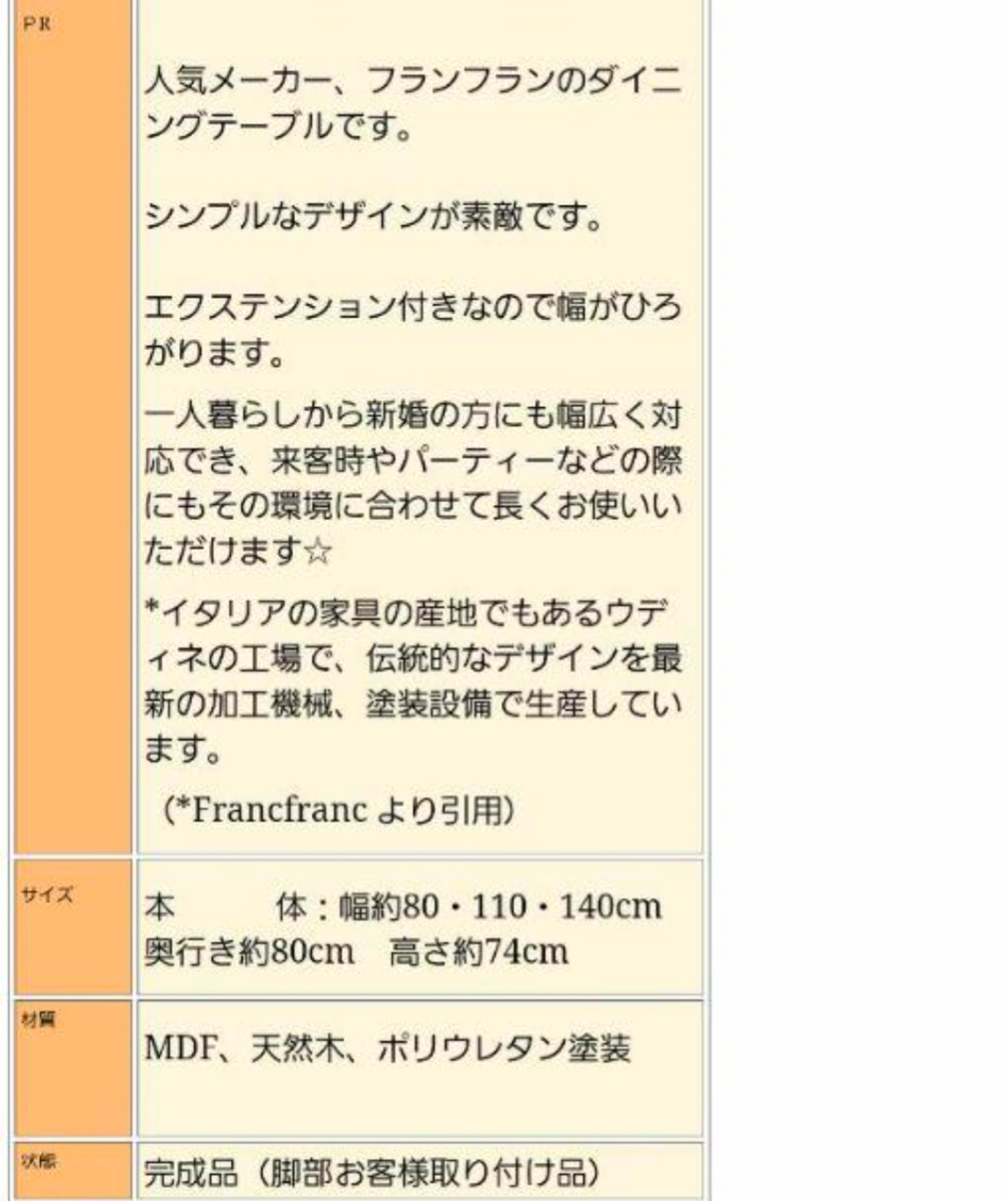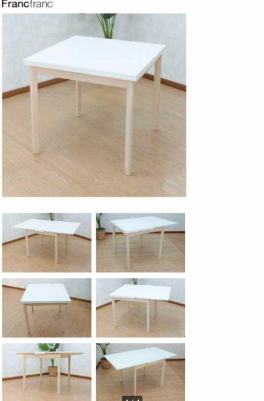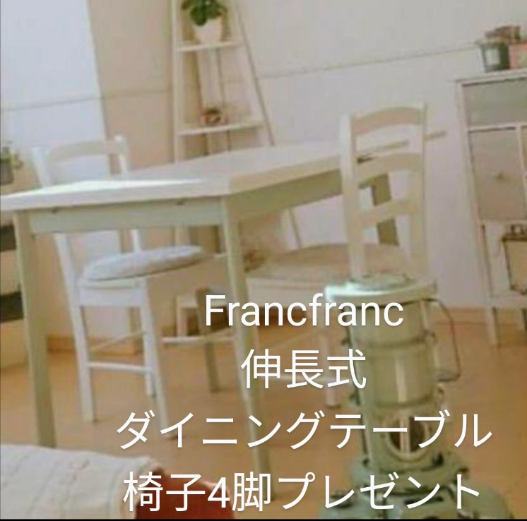Francfrancのダイニングテーブルになります。 8年近く使ったので、傷や汚れは多少あります。(多少についてはあくまでも個人の見解です) 伸長式ですのでサイズを自由に変えることができます。 足が、ミントグリーンでとても可愛いです。 フランフランではありませんが、椅子も4脚プレゼントでおつけします(グラつき等あるものもあります) 11月1日の引っ越しまでに、お引取りに来ていただける方、宜しくお願い致します。