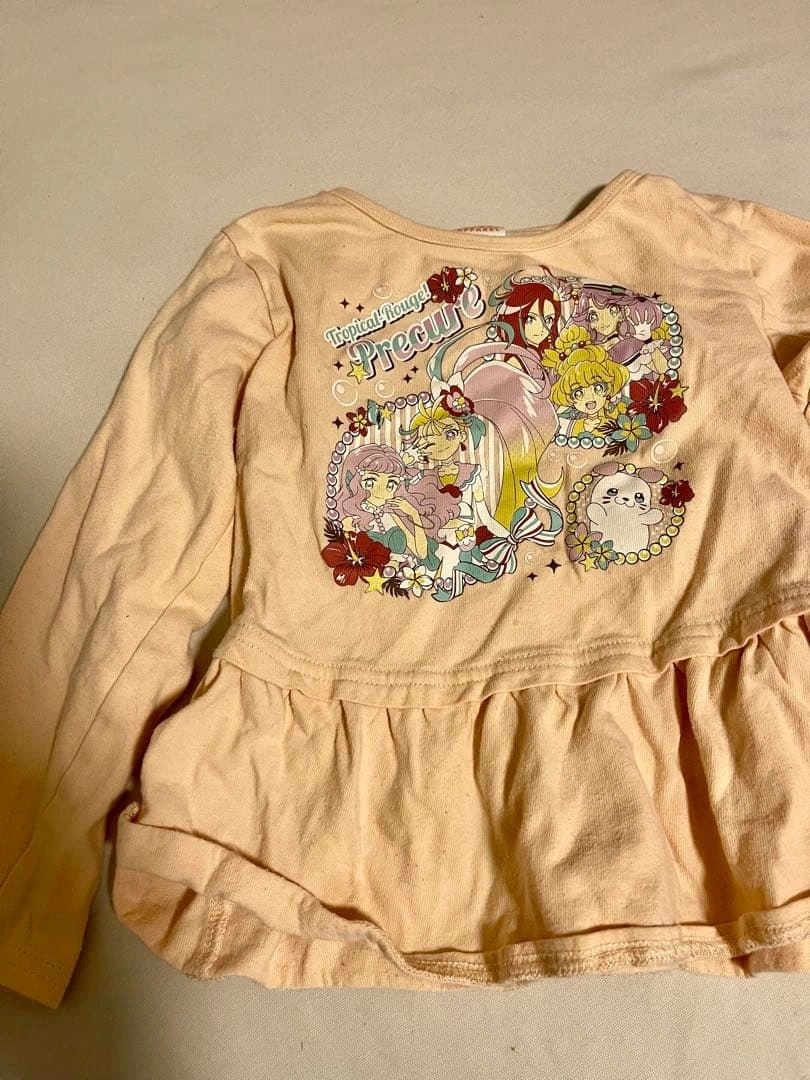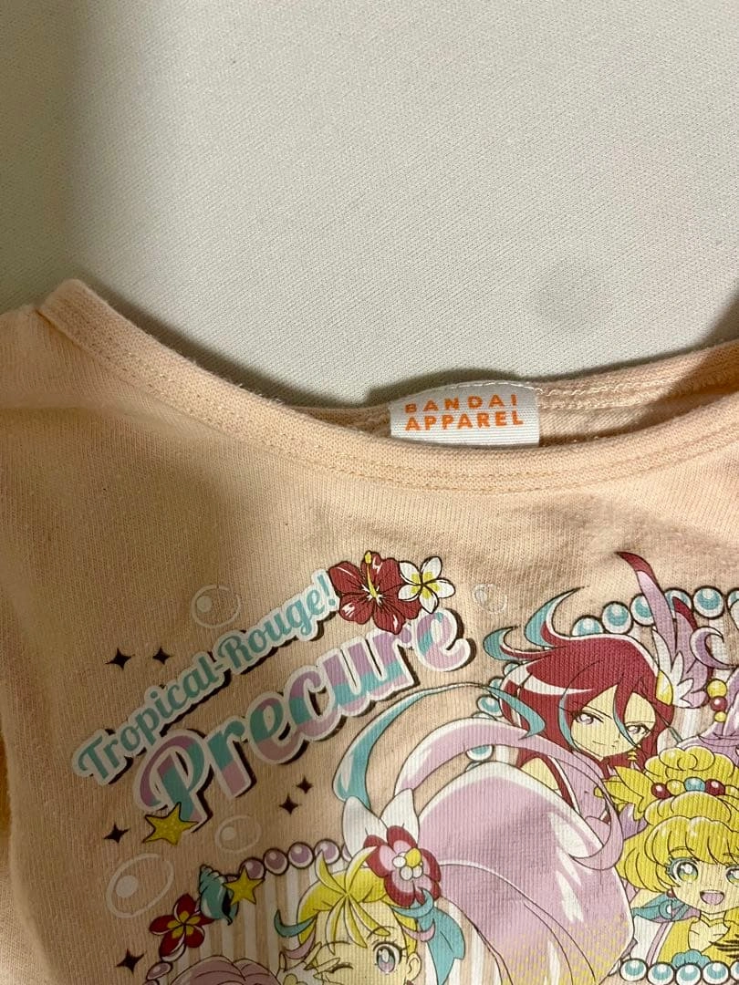 Tropical Rouge Precureの可愛いデザインの110サイズの長袖トップスです。 保育園で使用していたものです。 目で見てわかる汚れや毛羽立ちは写真にてご確認ください。 綺麗なものもありますが、使用感見られます。 完全中古ですのでご理解ある方のご検討をお願いいたします。 - サイズ: 110 - ブランド: Bandai Apparel - デザイン: Tropical Rouge Precureのキャラクタープリント 性別···女の子 季節感···春,夏,秋 ご希望の方はお気軽にご連絡ください。