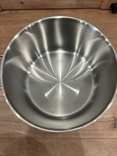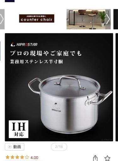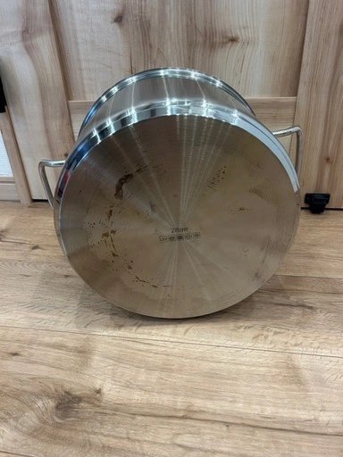 1万円程で購入し、麺を茹でるのに2回使用したのですが、私には重たくてなかなか出番がないので出品いたします。 小傷や底に焦げつきございますので、ご了承ください。 IH対応です。 こどもが5人おりますので、日中以外は、自宅までのお引き取りをお願いいたします。 ●商品名:IH半寸胴鍋(蓋付)28cm 業務用電磁調理器対応鍋 ●サイズ:内径280mm 外径293×高190mm 底径260mm ●板厚:0.8mm ●容量:約11.0L(満水時) ●材質:本体/蓋:ステンレス21-0 底:ステンレス18-0・アルミニウム ●重量:約2.8kg ●メーカー:KIPROSTAR(キプロスター) ●食洗機対応 ※200V電磁調理器は非常にパワーがある為、鍋の変形防止・安全面からボリュームは中以下で、鍋の状態、内部の温度には細心の注意をお願いします。 ※空炊きはしないでください。鍋本体の損傷の原因になります。 ※調理の際に多量の塩分を使用しますと錆が出る恐れがありますので、使用後のお手入れを十分に行って下さい。