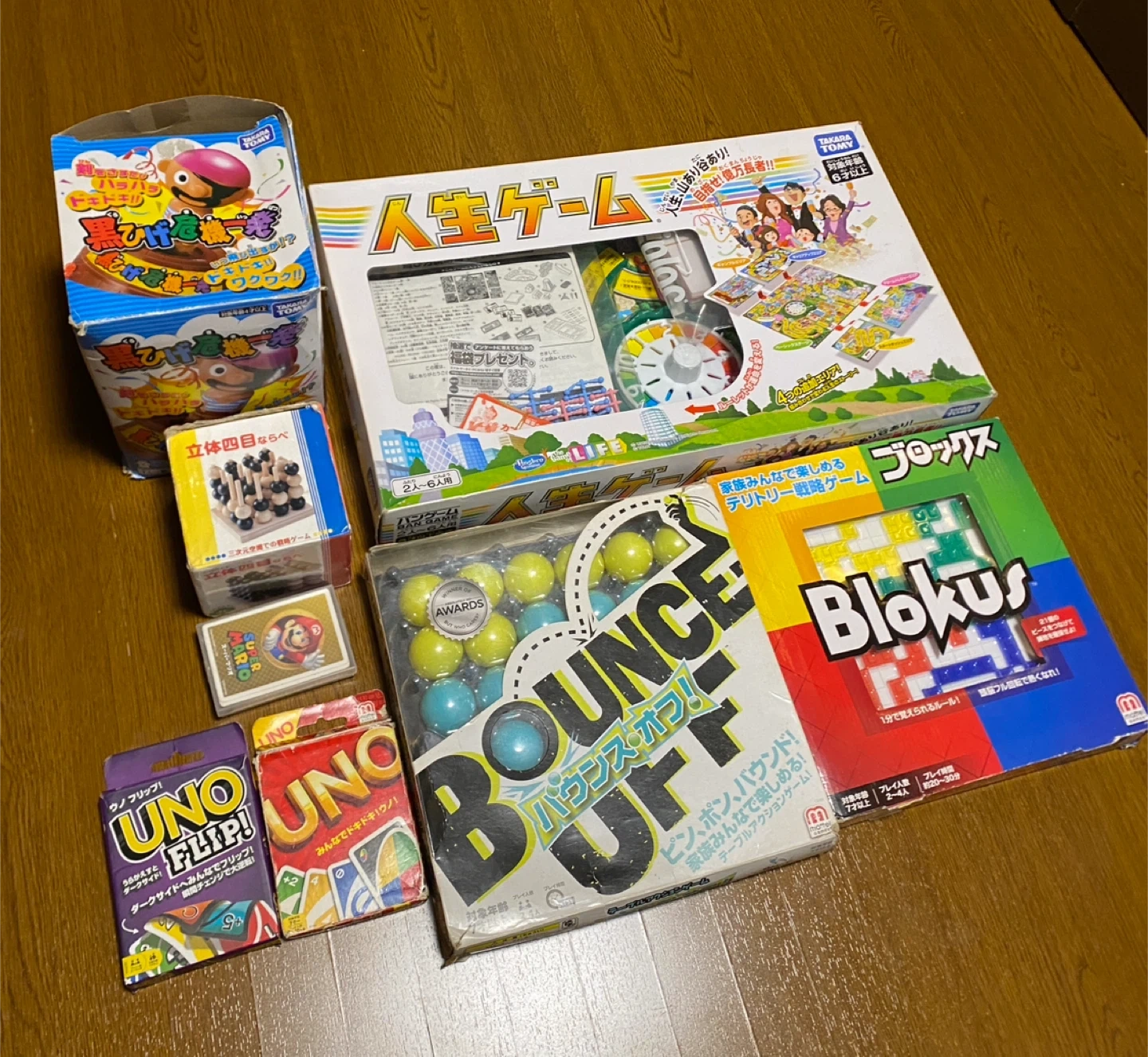 13.14日優先 まとめてお取引してくださる方はお安くします。 ボードゲームとカードゲームのセットです! 友達などはもちろん家族や子供とワイワイ遊べます! 人生ゲーム、ブロックス、バウンスオフ、黒ひげ危機一発、ウノ 、ウノフリップ、立体四目です。 傷や汚れがある物もありますので、ご了承ください。 黒ひげ危機一発の剣が1本ありません。