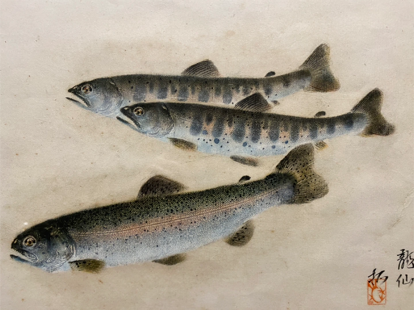 13.14日優先 まとめてお取引してくださる方はお安くします。 手描き 日本画 龍仙 直筆作品 サイズ:額込み 57×44cm 作者は雅号「龍仙」とあり、魚を写実的に描いた丁寧な作品です。 細部の描写がとても美しく、渓流魚(ヤマメ・ニジマス)の特徴が正確に描かれています。 ヤマメ・ニジマスの特徴がしっかり捉えられており、 パーマーク、背の青み、側線の明暗など、 釣り人なら“あ、これわかる”となるリアルな描写です。 魚体の質感や色の変化も自然で、 写真とは違う“時間の中で見た渓魚の姿”が感じられます。 表面は日本画特有のざらつきがあり、アナログの味がしっかり残っています。 光沢のないマットな質感なので、釣具部屋・リビング・玄関にも飾りやすいです。 古い作品のため、多少の経年感・紙の変色、汚れがありますが、大きなダメージはなく飾りやすい状態です。 ーーー 渓流釣りが好きな方 淡水魚が好きな方 魚の美しさがわかる方 釣具部屋のアクセントを探している方 ーーー に特におすすめです。 釣行帰りに眺めたくなる一枚です。 ヤマメ、ニジマス、トラウト、渓流魚、淡水魚、川魚、魚アート、魚の絵、魚図、日本画風、水彩画、手描き絵画、署名あり、落款あり、額装、インテリアアート、渓流釣り、トラウトフィッシング、ルアー釣り、フライフィッシング、釣り好き、釣り部屋、フィッシングアート 、玄関インテリア、自然、アウトドア、古民家風