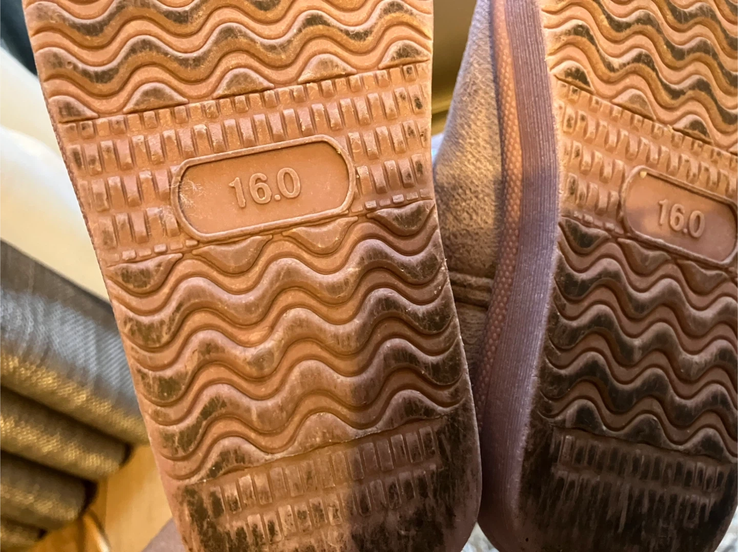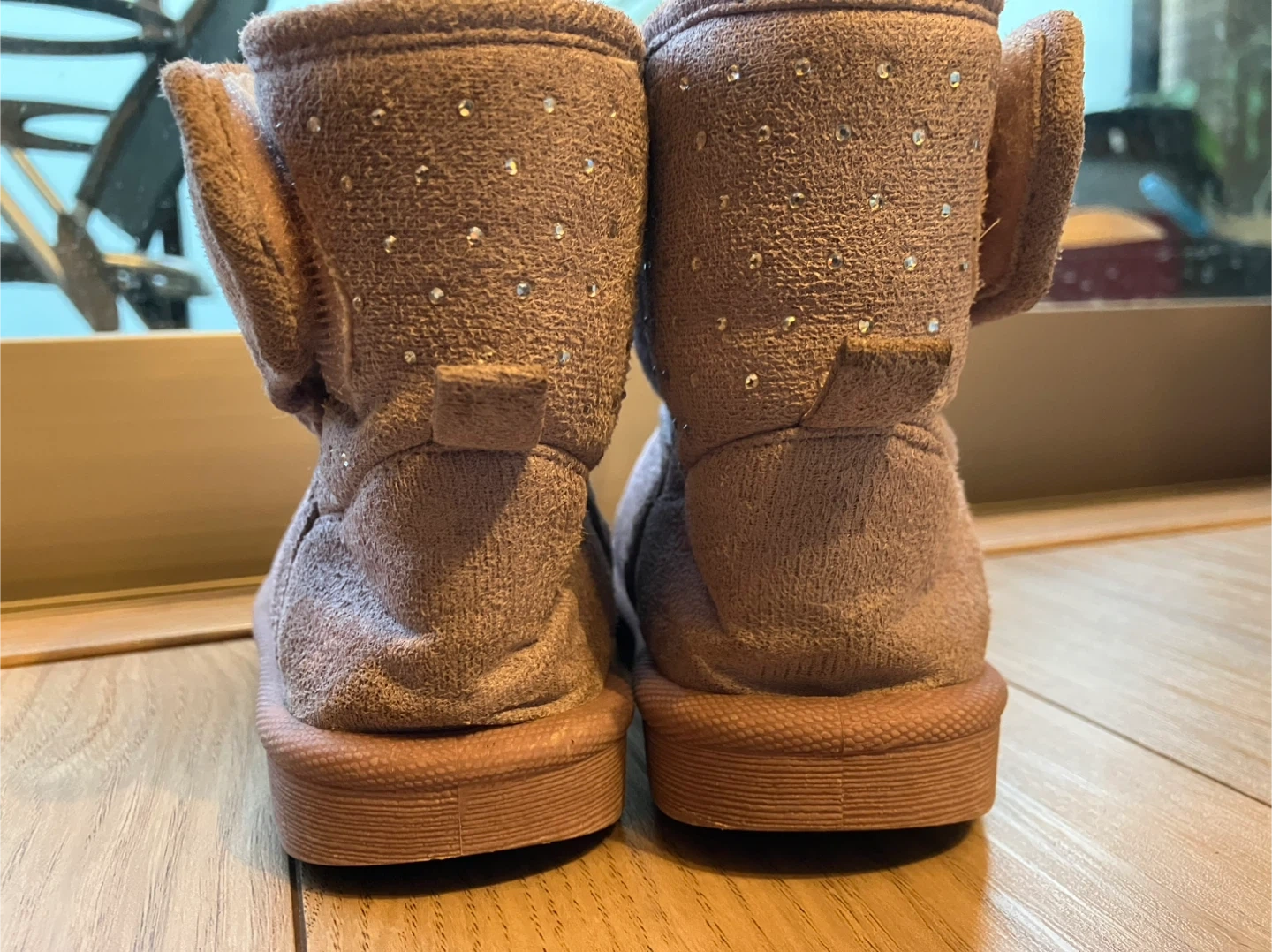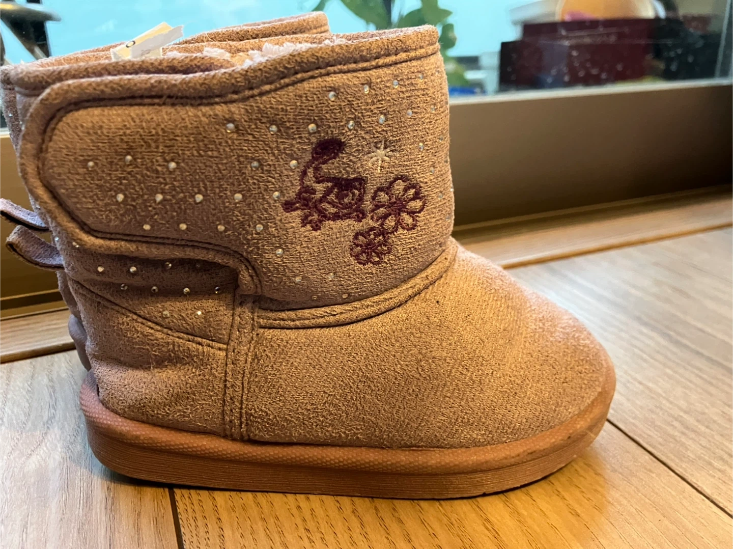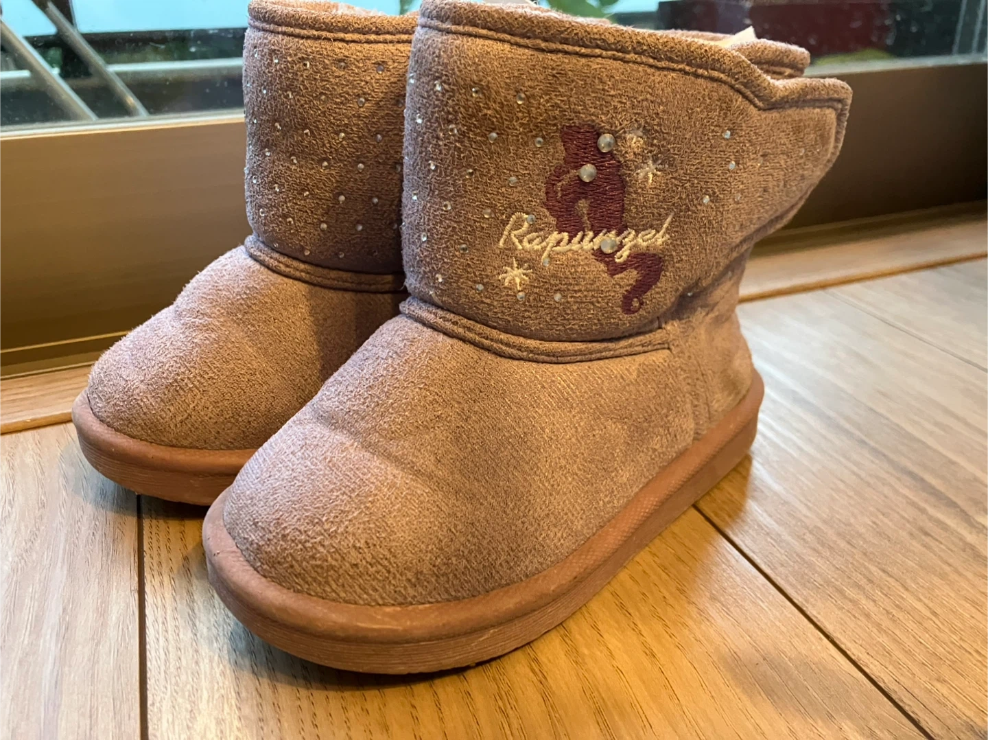 16センチ  ラプンツェルのムートンブーツです。 薄紫色でラプンツェルとパスカルの刺繍、そしてキラキラが付いており、女の子が大満足のブーツです。 内側は毛が付いており、とても暖かく履いて頂けます。 うっすら汚れありますが、これからの季節にいかがでしょうか?