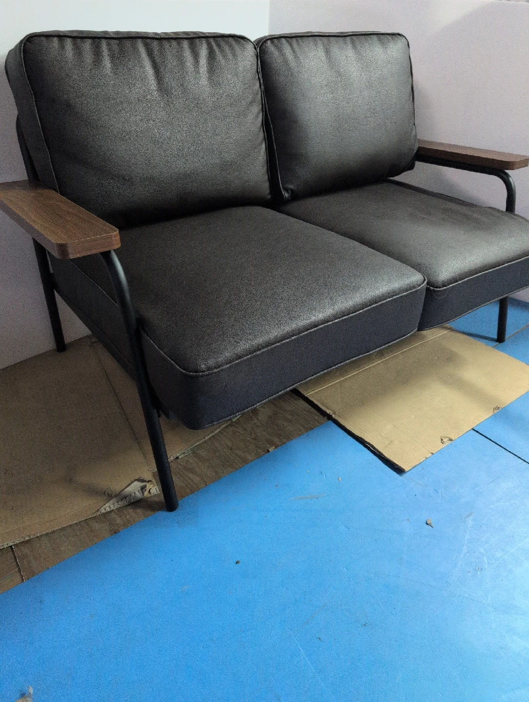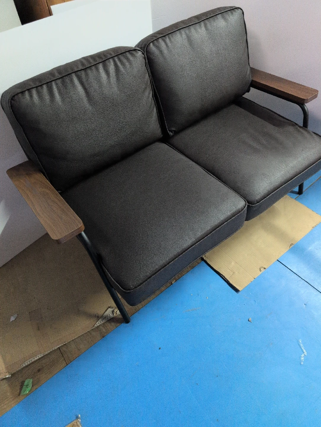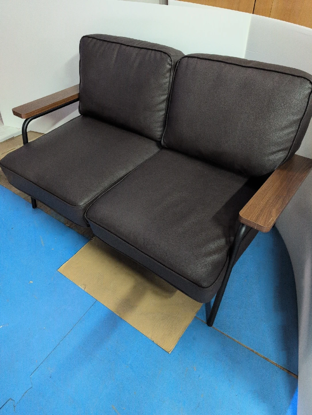 あたたかさダークブラウンの2人掛けソファです ・色:ダークブラウン ・肘掛け:木製 ・使用感少なめ 中古品であることご了承ください
