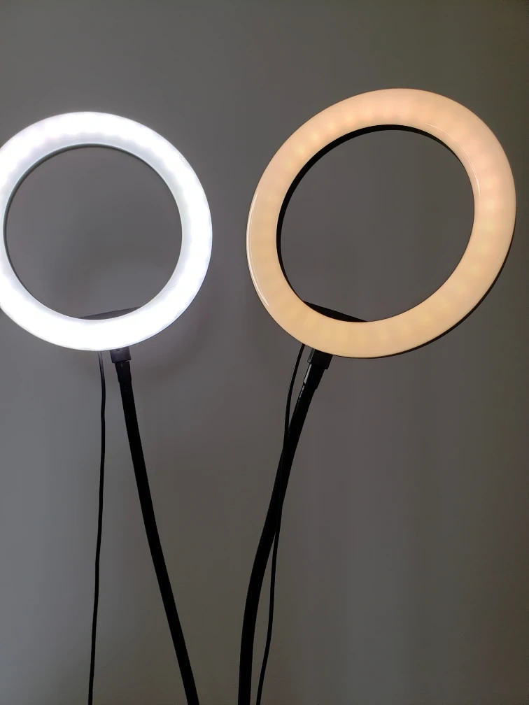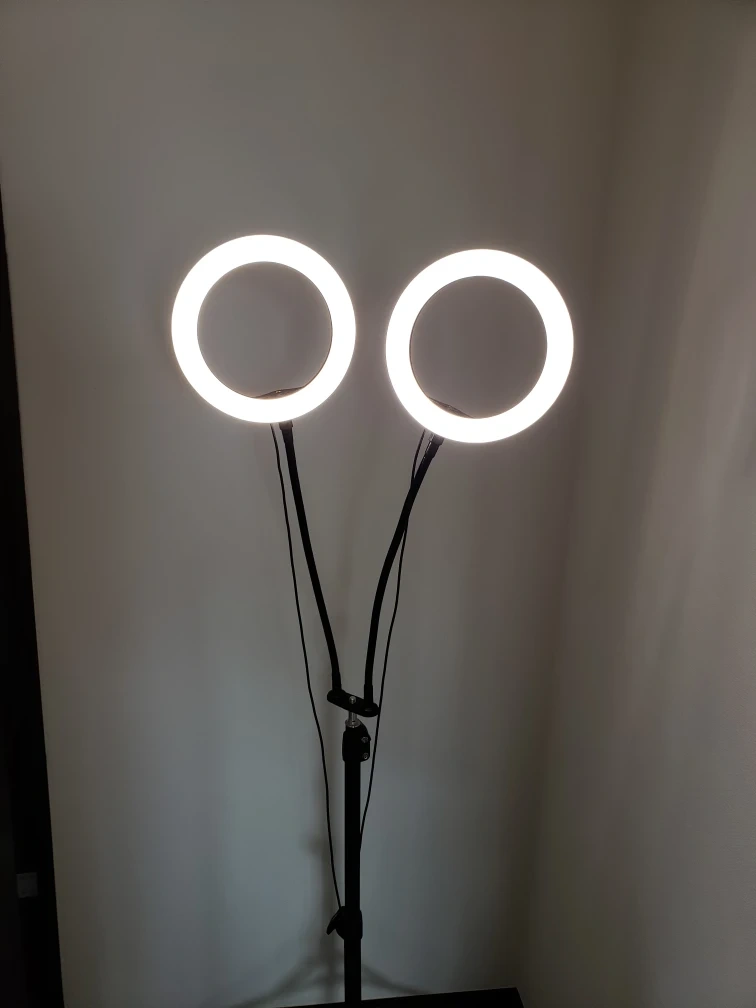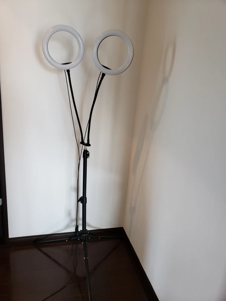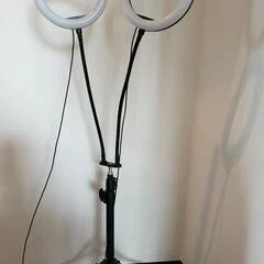 リングライトスタンドです。ZOOM会議や画像撮影に使用しておりました。電源ボタンに破損箇所ございます。ライトの色味の変更、明るさ調節できます。 ・カラー:ブラック ・USB給電 ・高さ調節可能 ・ON/OFF、調光ボタン付き 中古品であることご了承ください。