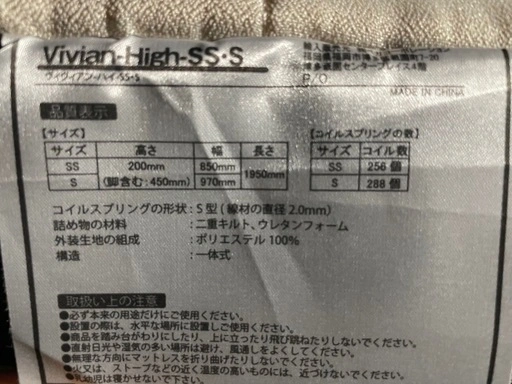 LOWYAの脚付きマットレスベッド「Vivian High」シリーズのシングル(S)サイズです。 【商品の状態】 総合:◯(4.25pt) 動作:◎ 傷:◯ 汚れ:◯ におい:◯ 年式:- 商品の状態は個人の感じ方により変わると思いますので、参考程度にお考えください。 清掃はしておりますが、写真では確認しづらい傷や汚れがある可能性があります。 写真の情報が全てです。 中古品にご理解頂けない方はご購入をお控えください。 返品やキャンセルは受け付けておりません。 【概要】 マットレスと脚が一体になった「脚付きマットレス」仕様で、ベッドフレームを別途用意する必要がないタイプです。 シングル幅サイズで、脚を付けて高さを確保したタイプです。 【主な仕様】 サイズ(シングル/S):幅 約 97 cm × 長さ 約 195 cm 高さ(脚含む):約 450 mm(マットレス厚+脚部分)という記載あり。 外装生地:ポリエステル100% コイル数・構造:ボンネルコイル仕様でコイル数 ≈ 288個という記載あり。 耐荷重・脚素材などの詳細は明確な公表が見つかりません。 【特徴】 脚付き構造により、床下に空間ができるので、収納スペースとしても活用しやすいです。 ベッドフレームを別途購入せず「脚付きマットレス」で済むため、比較的設置が簡単です。 シングルサイズながら「高さ」をとるタイプなので、ベッド下の抜け感や立ち上がりの動作がラクです。 【お渡し場所】 横浜市港南区 ご希望の方はお気軽にご連絡ください。