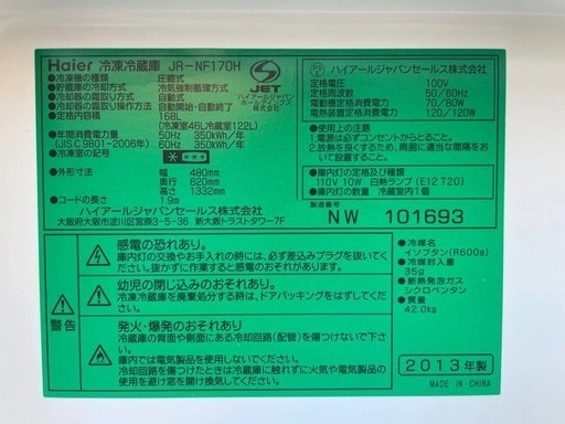 【商品の状態】 総合:◯(3.71pt) ※ptは四捨五入した数値を印に反映してます。 動作:◎ 傷(外装):◯ 傷(内装):◯ 汚れ(外装):◯ 汚れ(内装):◯ におい:◯ 年式:× ◎=5pt ◯=4pt ▲=3pt △=2pt ×=1pt -=対象外 【注意事項】 商品の状態は個人の感じ方により変わると思います。参考程度にお考えください。 お問合せに対し返信ができない場合がございます。 清掃はしておりますが、写真では確認しづらい傷や汚れがある可能性があります。 写真の情報が全てです。 中古品にご理解頂けない方はご購入はお控えください。 返品やキャンセルは受け付けておりません。 【お渡し場所】 横浜市港南区 【概要】 • 168L の容量を持つコンパクトな 2ドア冷凍冷蔵庫。  • 単身〜ふたり暮らしに向いたサイズで、設置場所を選びにくい「スリムボディ」。  【主な仕様】 • 冷蔵室容量:122 L  • 冷凍室容量:46 L(2段式ビッグフリーザー)  • 外形寸法:幅 480 mm × 奥行 620 mm × 高さ 1,332 mm  • 質量:約 42 kg  • 冷却方式:ファン式/ノンフロン(R600a)  • 電源:単相100V(50/60Hz 共用)  • 年間消費電力量:約 350 kWh/年(2010年基準省エネ率112%)  【特徴】 • 静音設計(運転音約 25 dB)で、ワンルームなどでも音が気になりづらい。  • 2段式の大容量フリーザー付きで、冷凍食品やアイスなど分けて整理保存しやすい。  • ドアポケット3段付きで、飲み物や小物の整理がしやすく、使い勝手が良い。  • 霜取りが自動で、手間がかからないファン冷却方式。 【オプション】 ・配送料:5,000円〜 ※場所により異なります。 詳しくは下記内容を入力の上、直接お問合せください。 ・住所 ・建物の種類 戸建てor集合住宅 ※集合住宅の場合お住まいの階数とエレベーターの有無も合わせて入力お願い致します。 ・時間指定:0円〜 ①9:00〜12:00 ②12:00〜15:00 ③15:00〜18:00 ④18:00〜20:00 ⑤いつでも ・下取り:0円〜 ※商品により買取出来る場合あり。