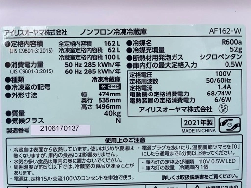 アイリスオーヤマ(IRIS OHYAMA)のノンフロン冷凍冷蔵庫、AF162-W、2021年製です。 【商品の状態】 総合:◯(4.14pt) ※ptは四捨五入した数値を印に反映してます。 動作:◎ 傷(外装):◯ 傷(内装):◯ 汚れ(外装):◯ 汚れ(内装):◯ におい:◯ 年式:◯ ◎=5pt ◯=4pt ▲=3pt △=2pt ×=1pt -=対象外 商品の状態は個人の感じ方により変わると思いますので、参考程度にお考えください。 清掃はしておりますが、写真では確認しづらい傷や汚れがある可能性があります。 写真の情報が全てです。 中古品にご理解頂けない方はご購入はお控えください。 返品やキャンセルは受け付けておりません。 【お渡し場所】 横浜市港南区 【概要】 総容量162Lの2ドア冷凍冷蔵庫です。冷蔵室100 L、冷凍室62 L。 奥行約53.5 cm、幅47.4 cm、高さ約149.6 cm のスリム設計。 右開きドア、2ドア構成。 【主な仕様】 容量:総容量162 L(冷蔵100 L / 冷凍62 L) 外形寸法:幅474 × 奥行535 × 高さ1496 mm 重量:約40 kg ドア開閉タイプ:右開き 2ドア 消費電力量:約285 kWh/年(50/60Hz)/年間目安電気代 約7,650円 冷凍室:引き出し式で、霜が付きにくく冷凍焼けを抑制。 冷蔵室:高さ調節可能なガラス棚、小物/ボトル用ポケット、ドアポケット、クリアケース付きで整理しやすい。 電源:AC100V(50/60Hz) 【特徴】 コンパクトながら冷凍容量62 Lと大きく、冷凍食品や作り置きの収納に便利。 スリム設計で置き場所を選びません。 冷凍室が引き出し式で霜が付きにくい。 冷蔵室は棚やポケットが工夫されており、整理がしやすい。 【オプション】 ・配送料:5,000円〜 ※場所により異なります。詳しくは下記内容を入力の上、直接お問合せください。 ・住所 ・建物の種類(戸建てor集合住宅) ※集合住宅の場合お住まいの階数とエレベーターの有無も合わせて入力お願い致します。 ・時間指定:0円〜 ①9:00〜12:00 ②12:00〜15:00 ③15:00〜18:00 ④18:00〜20:00 ⑤いつでも ・下取り:0円〜 ※商品により買取出来る場合あり。