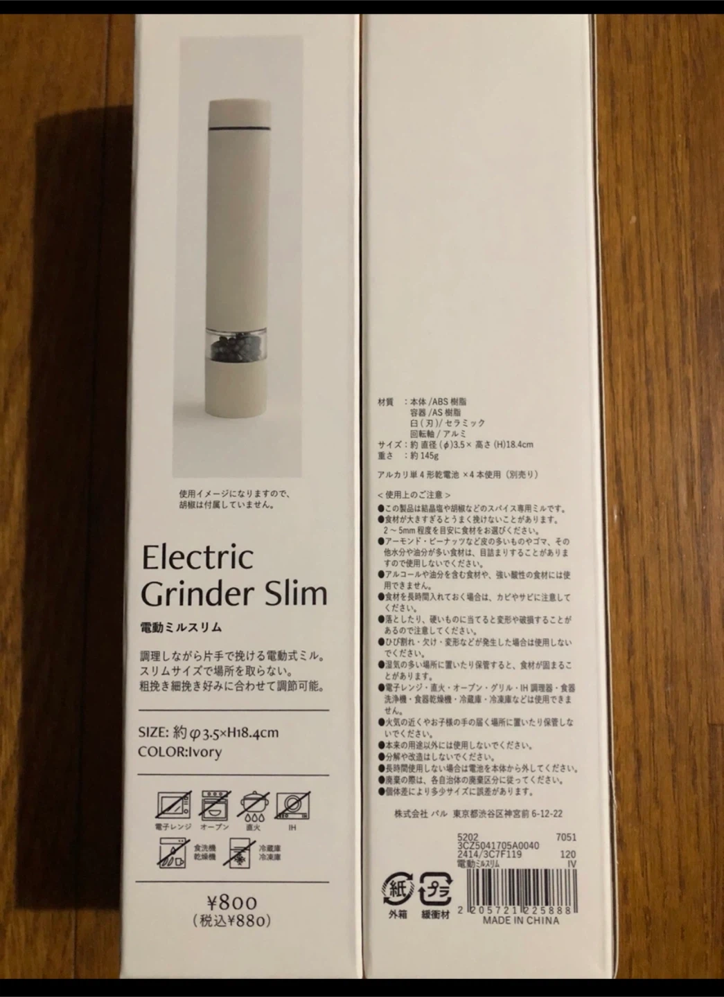 〝3COINS〟で購入した 電動ミル×2個 商品状態: ほぼ 新品 未使用  購入後に開封し一度塩胡椒を入れましたが直後すぐ取り出しました その後 自宅保管しています 片手でグラインドできるのでお料理時に便利です また食事の際に食卓に置いても邪魔にならないサイズ感です 素材サイズ他: 外箱裏面写真ご確認ください 詳細情報は下記3coinsのリンク先で ご確認ください https://www.palcloset.jp/display/item/2414-3C7F119-00/ ご質問などはお気軽にご連絡ください