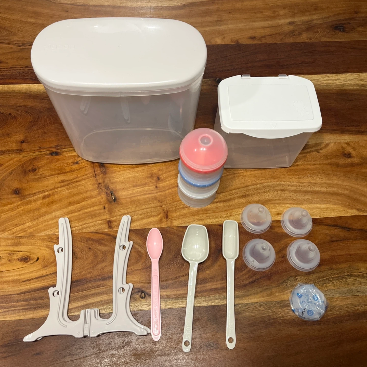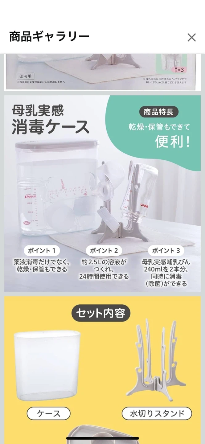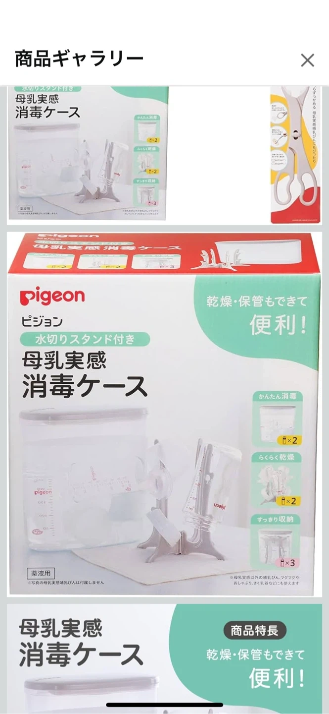【出産準備おまとめ6種類11点セット】 合計7000円程度 ★Pigeon 母乳実感消毒ケース 水切りスタンド付き 定価2300円 ★母乳実感乳首 SSサイズ2個 定価1700円 ★母乳実感乳首 Sサイズ3個(うち1つ未使用) 定価2550円 ※乳首は両サイズともに1ヶ月弱程度使用。吸い口に切れなどもございません。 ★e赤ちゃんエコらくパックケース× ※ケースがあればはじめてセットの購入の必要がなくなります。 ★粉ミルク持ち歩きケース ★粉ミルクスプーン3種 20ml.50ml.100ml 【Pigeon 母乳実感消毒ケース】 水切りスタンド付きで、母乳実感の哺乳瓶を清潔に保管できる消毒ケースです。 - ブランド: Pigeon - 商品名: 母乳実感消毒ケース - セット内容: ケース、スタンド - 特徴: 水切りスタンド付き、乾燥・保管が可能 - サイズ 幅215mm、奥行き117mm、高さ223mm、重量530g、容量2.5L、生産国日本 中古品であることをご了承ください。
