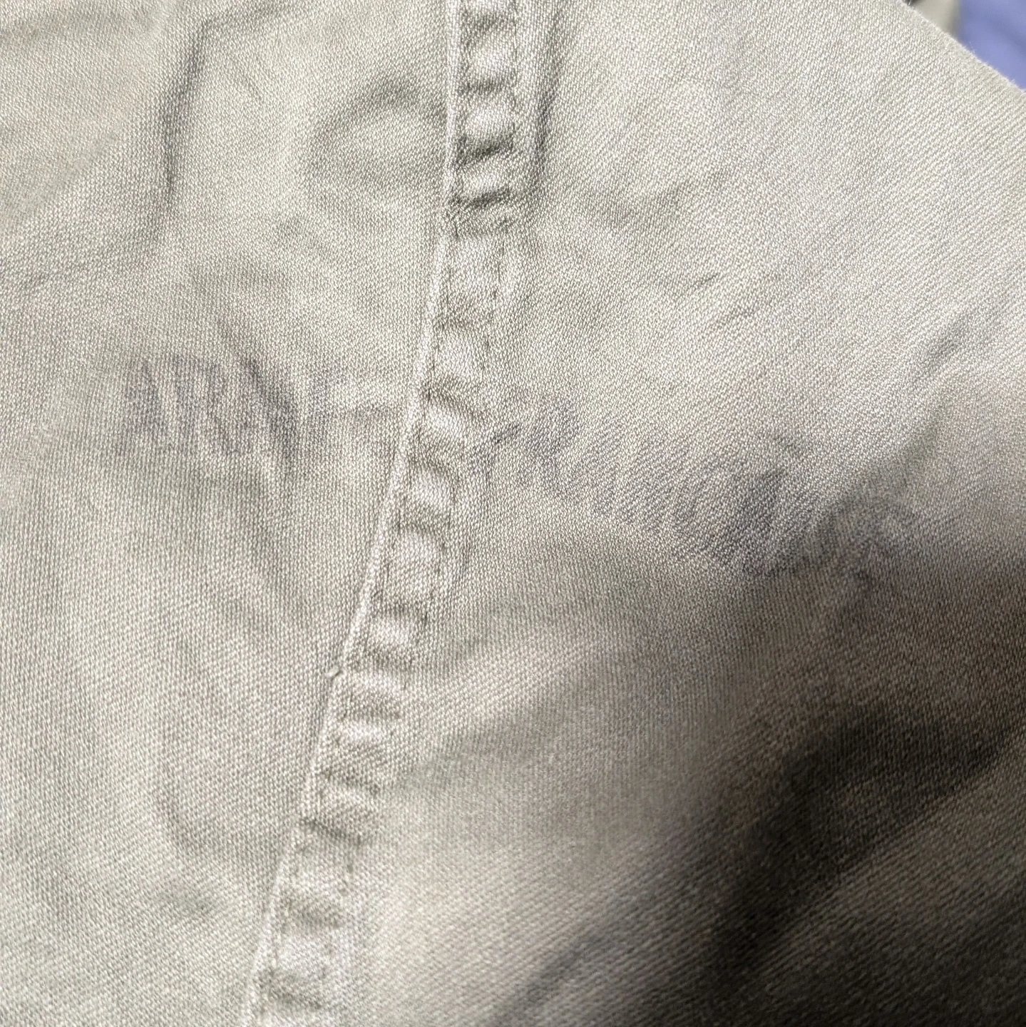 以前専門店で購入したモッズコート、フランス軍M-64 フィールドパーカーです。 フレンチミリタリー特有のデザイン性のあるシルエット、肌触りの良いサテン生地。ライナー付きで両方とも1978年製というなかなかない組み合わせです。 肩にも薄っすらステンシルあり、ボタンの欠損もありません。 ダメージと致しましては購入時からファスナーの不良があり、テープと蝶棒(スライダーに差し込む金具)が破れておりましたので、接着剤で簡易的に修理してます(動作確認はしましたが、噛み合わせが悪くなる時があります。ボタンで止めれば防寒はできます) また当時の痕跡として縫直し跡があります、補強の為裏から別の布を当てミシンで縫いました。 他、サビ?のような汚れもありますが、アジのような良い雰囲気かと思います。 状態考慮の上ご検討の程宜しくお願い致します。 シェル 身幅...65cm 袖丈...78cm 着丈...88cm ライナー 身幅...61m 袖丈...69cm 着丈...77cm カラー...グリーン