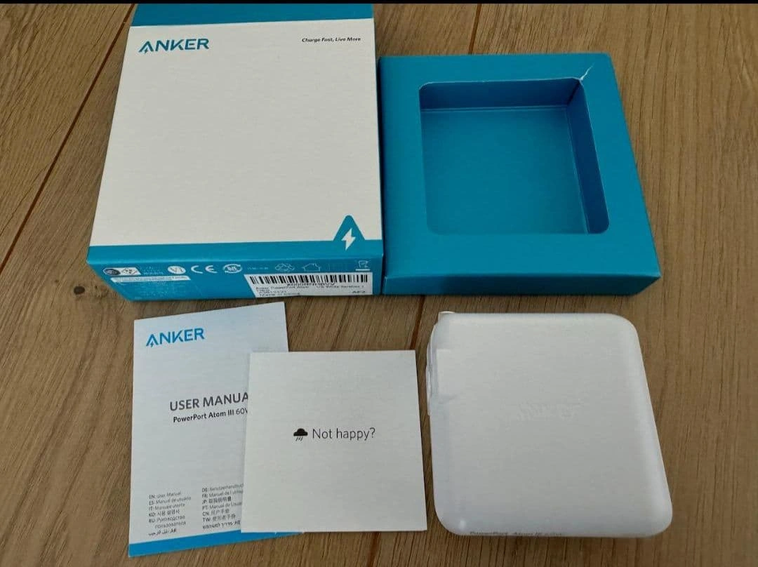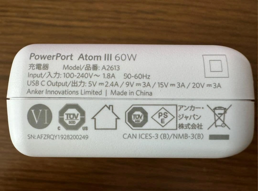AnkerのUSB-C急速充電器です。最大60Wの出力があるためスマホ、タブレットはもちろん、MacBook、WindowsなどのノートPCへの電源供給も可能です。 購入したのですが使用してなかったため出品します。 箱などの付属品もすべて揃っています。 (Anker公式サイトより) ▼PowerIQ 3.0 Ankerの独自技術PowerIQがさらに進化。USB Power DeliveryやQualcomm Quick Chargeなどと互換性のある新世代の充電技術PowerIQ3.0により、ほぼすべての機器に対して最適かつ最速の充電スピードを実現しました。スマートフォン、タブレット端末、ノートPCなどほとんどの機器にフルスピード充電が可能です。 ▼新素材 GaN (窒化ガリウム) 採用 これまで使用していたシリコン半導体に代わり次世代パワー半導体素材「GaN」を世界に先駆けてUSB急速充電器に採用し、これまでにない小さなサイズにAnker独自の充電技術を詰め込みました。 ▼コンパクトでハイパワー 最大60Wの高出力をそのままに、前モデルのAnker PowerPort Speed 1 PD 60から更に小型化を実現しました。最新のMacBook Proを含むノートPCなど幅広いUSB-C機器へフルスピード充電が可能です。 ▼フルスピード充電技術 Anker独自技術のPowerIQ 3.0によりMacBookや Samsung Galaxy、MacBookなどのノートPCや携帯ゲーム機に至るまで様々なUSB-C搭載機器へフルスピード充電することができます。この充電器1ひとつでお手持ちのUSB-C対応機器をほぼ全て充電することができます。 ▼外出用にも最適 折りたたみ式プラグを搭載し、一般的なノートPC付属の60W出力充電器よりも35%小さいサイズで、持ち運びやすさを追求しました。 ▼製品仕様 サイズ: 約61 × 58 × 28 mm 重さ: 約132g 入力: 100-240V 〜 1.8A 50-60Hz 出力: 5V=2.4A / 9V=3A / 15V=3A / 20V=3A 最大出力: 60W 製品型番: A2613121(ホワイト)