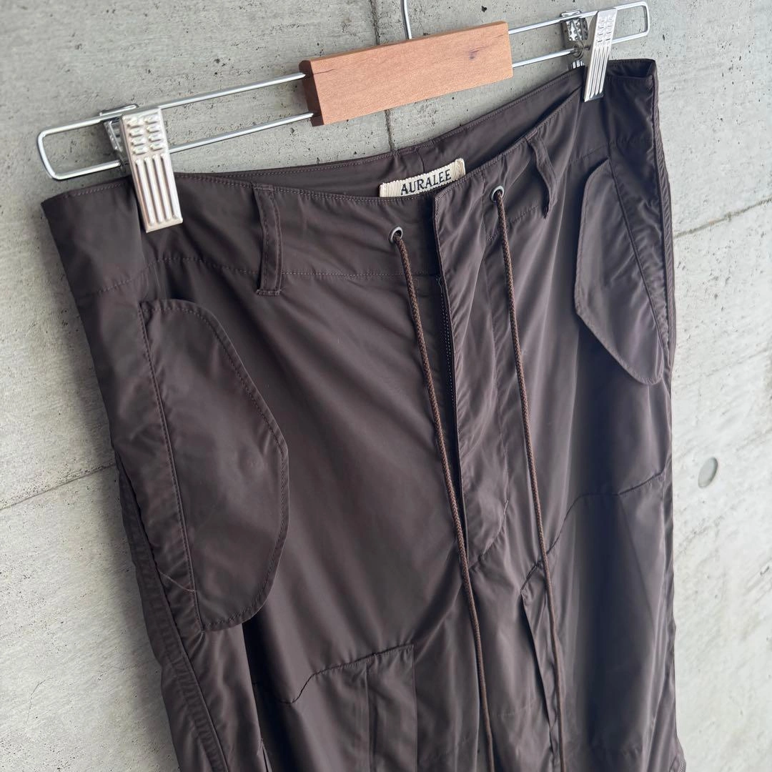 AURALEE LIGHT NYLON FATIGUE PANTS ブラウンです。 サイズは1です。 ウエスト:35cm / 股上:35cm / 股下:76.5cm / 腿幅:32cm / 裾幅:14cm (平置き) 素人採寸の為、多少のズレはご了承ください。 カラーはブラウン。 素材はナイロンです。 ウエストに目を引く長めのドローコードが入っています。非常に綺麗で上品な表情を持つ独自のナイロン素材で仕上げた「ファティー グパンツ」です。 素材には強撚した特殊なナイロン糸を使用し、高密度に織り上げたタフタ素材を使用しています。 ナイロンが持つ機能性を持ちながらも、肌離れが非常に良く、程良いハリ感と落ち感、光沢感や軽さが特徴で、夏場でも快適に、かつナイロンとは思えないような上質な履き心地を実感して頂けます。 ご不明点はお気軽にお問い合わせください。